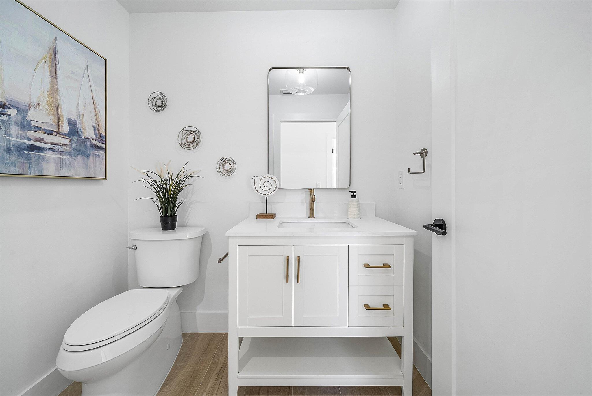 Beautifully renovated two-story townhouse with 3-bedrooms, 3 bathroom offering modern elegance with a serene and private back yard. The spacious layout features a guest bedroom conveniently located on the main level, while the primary suite and an additional guest bedroom are upstairs for added privacy. The home showcases porcelain plank wood flooring on the first level, and a striking glass-railing staircase. The gourmet kitchen is equipped with premium appliances, French door refrigerator, along with a wine cooler, quartz backsplash, and sleek finishes. The primary suite boasts a double-sink vanity and an extra-large shower. Additional highlights include a new AC system, new impact windows, LG washer and dryer, and an epoxy-finished garage floor.