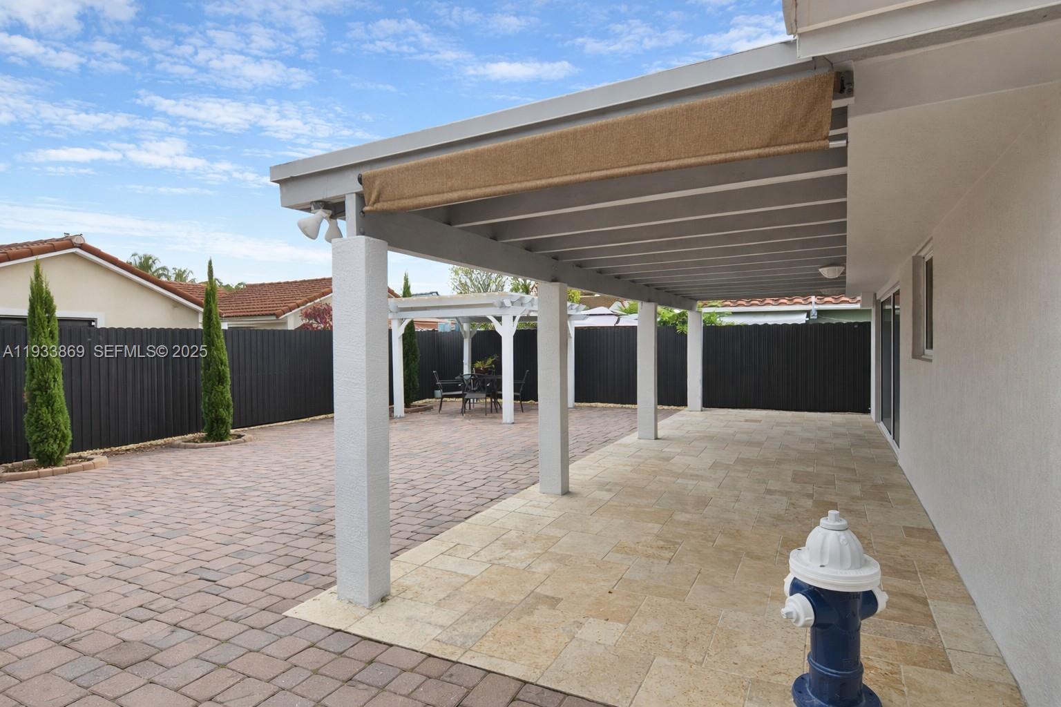 Beautifully updated single-family residence offering a modern design and thoughtful upgrades throughout. This 3-bedroom, 2-bath home features a side covered carport and NO HOA, providing flexibility and convenience. The property is freshly painted and move-in ready, with hurricane shutters on all windows and doors for added protection. Inside, enjoy stainless steel appliances, quartz countertops, and durable waterproof laminate flooring in all bedrooms, complemented by custom-built closets. The spacious, fully patio pavers backyard includes a covered wood terrace, ideal for outdoor entertaining, extended living space, or dining al fresco. Metal fencing surrounds the property, offering privacy and security. A storage room with direct terrace access adds extra functionality. Ideally located within walking distance to the newly built Herbert A. Ammons Middle School (ranked among Florida’s top schools) and just minutes from Publix Plaza on 147th Avenue, the Florida Turnpike, Miami Zoo, and multiple parks. Set in a quiet neighborhood, this home combines location, upgrades, and value.