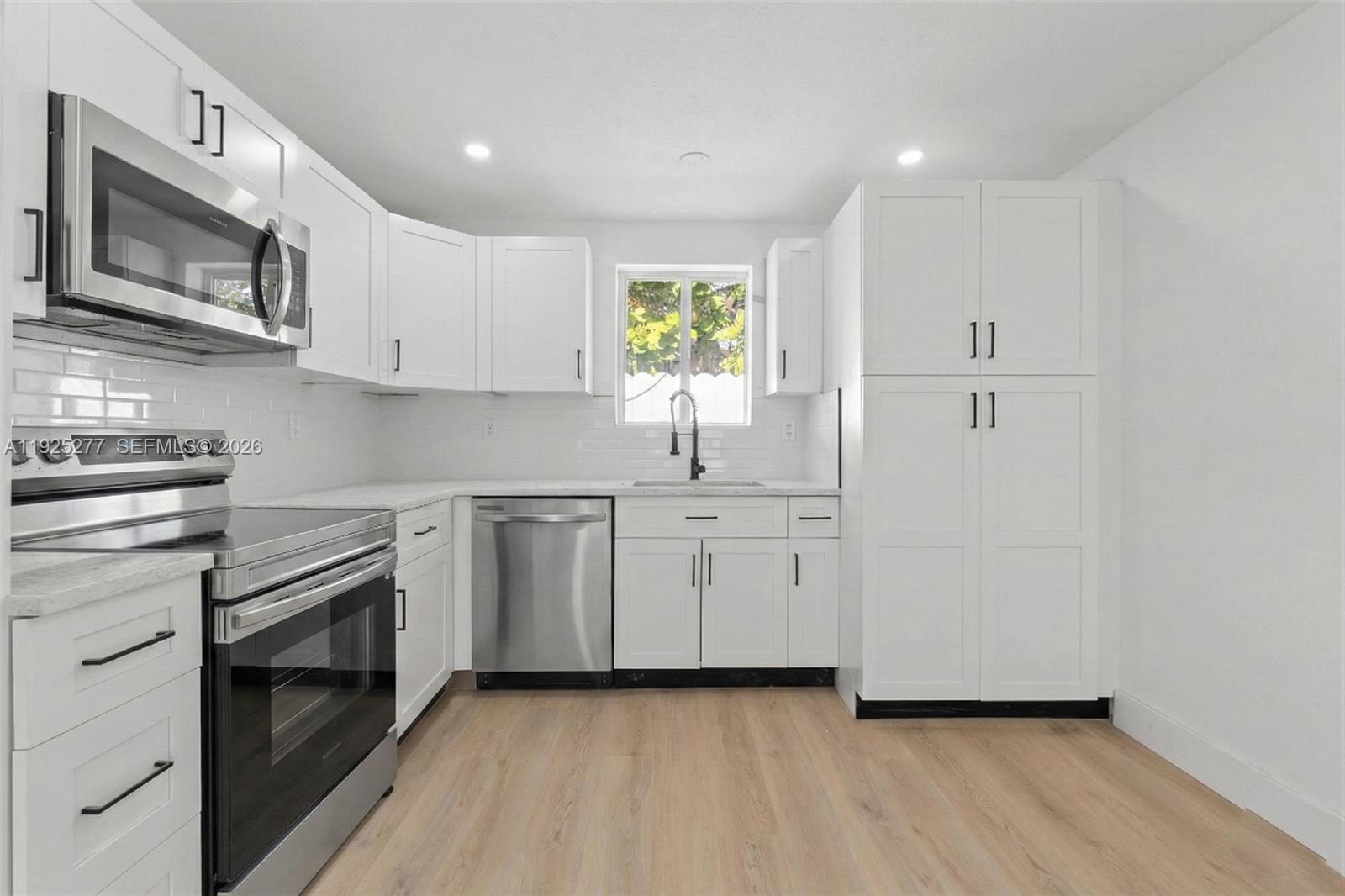 Beautifully renovated single family home featuring a modern open layout and a spacious front yard. The property offers new flooring, recessed lighting, impact windows, and a brand new kitchen with quartz countertops, white shaker cabinets, and stainless steel appliances. Bathrooms have been fully remodeled with contemporary finishes and walk in showers. The home also features a brand new roof and a large private driveway with space for up to five vehicles, with additional room for an RV, boat, or work truck. The expansive front yard provides excellent outdoor space for gatherings or future landscaping improvements. Conveniently located near major highways, shopping centers, schools, and public transportation. No HOA. Move in ready and easy to show.