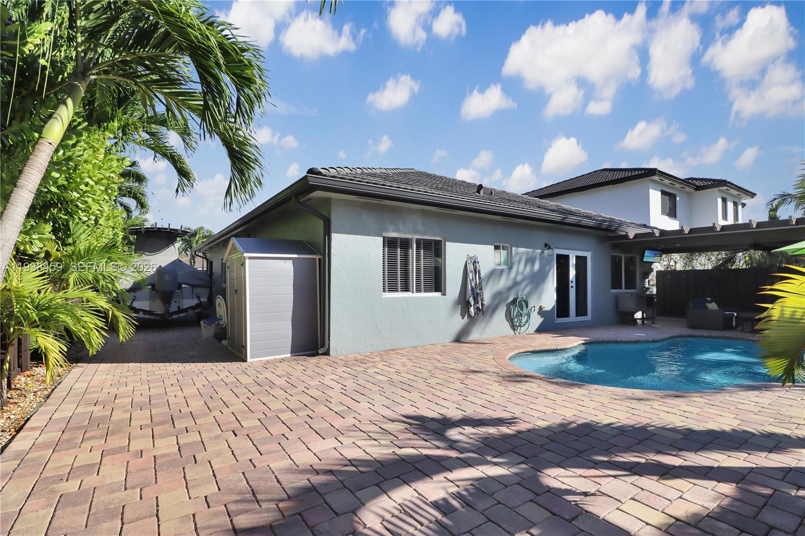 Discover this West Kendall gem featuring modern upgrades. The interior showcases sleek porcelain tiles throughout the main living areas, complemented by warm wood-like laminate flooring in the bedrooms. Elegant crown moldings lead into a fully updated kitchen complete with quartz countertops, a stylish backsplash, and recessed lighting. Both bathrooms have been tastefully modernized. For added peace of mind, the home is equipped with impact-resistant front and back doors. The exterior is an entertainer's delight, featuring a pergola overlooking a refreshing pool and ample side space for parking a boat. This move-in-ready home combines comfort, style, and utility in a highly sought-after location.