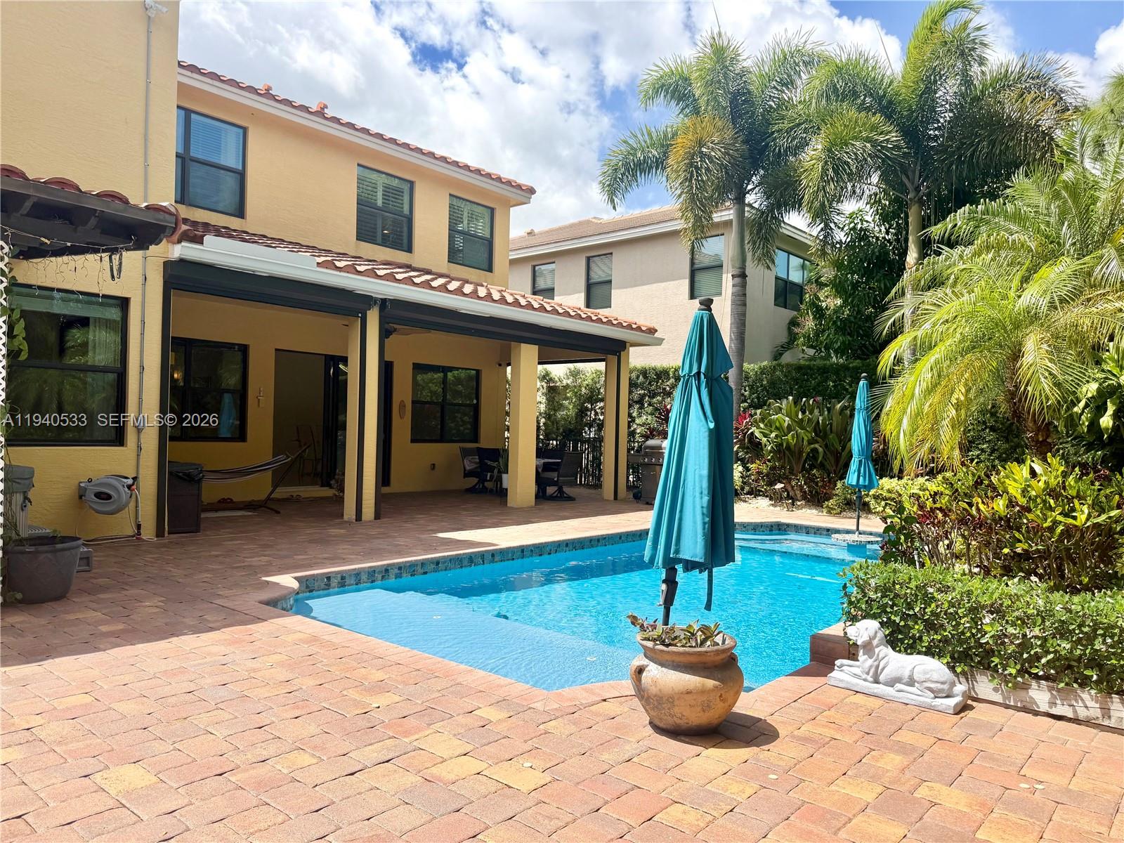 Spacious 5-bedroom, 4.5-bath residence (with potential for up to 7 rooms) including a fully finished office on the first floor and a sitting room off the primary suite that can easily function as an additional bedroom, nursery, or private Den***Located in a prestigious gated community with top A-rated schools, this modern home features a dramatic 20-ft foyer with custom wood and steel staircase, porcelain and wood flooring, and impact windows throughout***The chef’s kitchen offers a large island, double ovens, coffee bar, stainless steel appliances, soft-close cabinetry, and tiled backsplash***Step outside to a private resort-style backyard surrounded by lush greenery featuring a heated saltwater pool, cascading waterfall, sun deck, jacuzzi, and automated patio screens***Additional highlights include a two-car garage with epoxy flooring, wall A/C, refrigerator, generator switch, and low HOA of only $235/month.