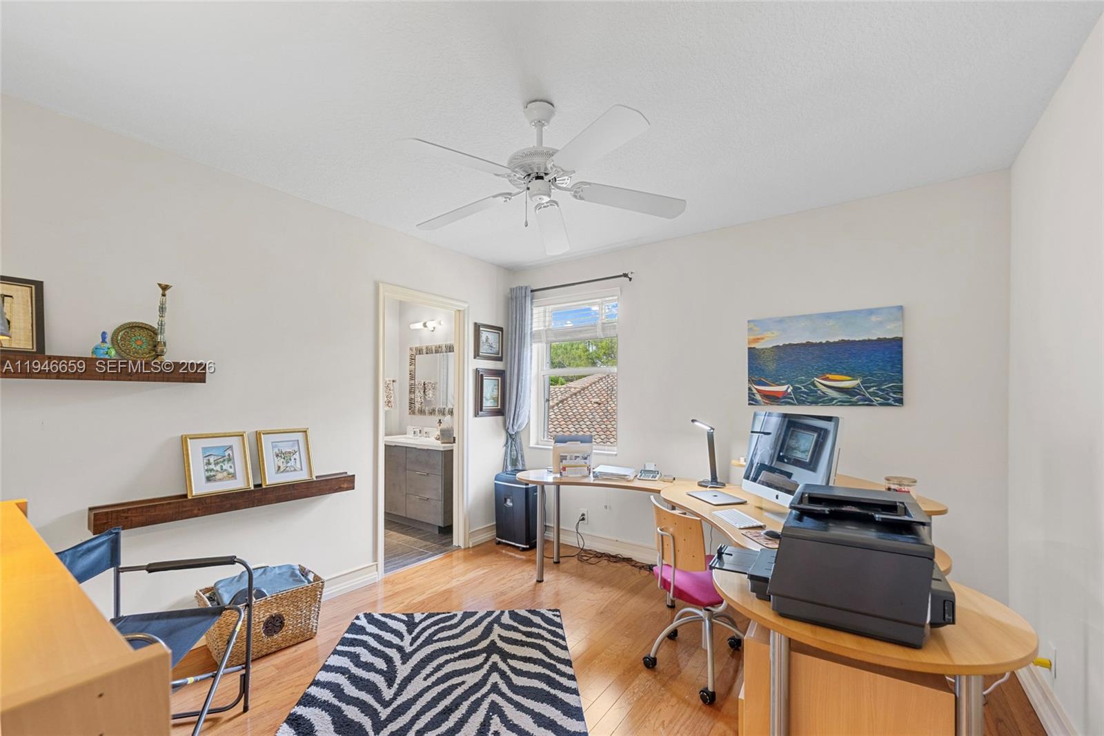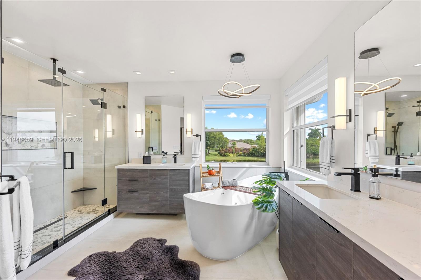 Remarkable home on a quiet cul-de-sac in exclusive Lake Ridge One enclave of 19 homes. This spacious two-story residence sits on a 15,000 sq ft lot with private water views and updated outdoor setting. Built in 1998, the home features 2025 roof with gutters, accordion hurricane protection (panels only on patio doors), and freshly painted exterior (2024). The screened patio, updated 2025, opens to a heated pool with paver deck and Diamond Brite finish (2023)—ideal for entertaining. Inside are five bedrooms + office and loft, four baths renovated with upscale fixtures and quartz countertops, and three-car garage. A first-floor bedroom with renovated cabana bath adds flexibility. The living room offers two-story ceilings, crown moldings, and stone floors on the main level, with wood flooring throughout bedrooms, loft, and staircase. The kitchen features white shaker cabinetry, center island, granite countertops, and stainless appliances including Thermador refrigerator, wall oven, convection microwave, downdraft vented cooktop, wine cooler and custom kitchen pantry. All closets are built out, and the laundry room includes newer cabinetry, countertops, and LG washer and dryer. Additional highlights include 2 A/C systems approx. 5 years old, water softener/filter, central vacuum, surround sound, Ring security, water heater (2 years old), and ADT alarm. The primary bath offers vessel tub, Moen smart shower, porcelain floors, and decorator lighting and window treatments.