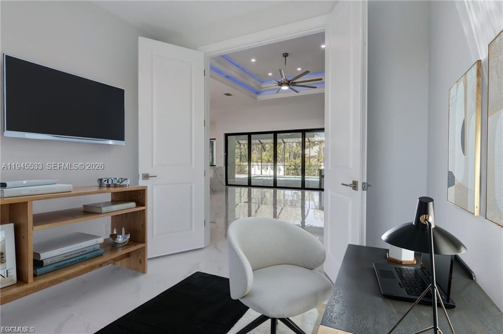 This is a Large home for the family and your guests with over 2560 air-conditioned Living space all with 4 Bedrooms, Office, 3 Full bathrooms and has 2 Primary Master suites, 3 car Garage, heated Pool & Jacuzzi, barbeque area with beverage cooler. South of Cape Coral Pkwy W. right by Cape Harbor. This Large dream home with over 2560 sq feet of Living space and over 4600 total spaces. Master Bedroom is large and has LED Tray Ceilings Double French Impact glass doors. Master Bathroom with walk-in shower large soaking tub with large back and front lit mirror Master suite guest bedroom, you have LED lited tray ceilings you have a Full Bathroom with lited mirror, walk-in closet. Bedroom has French Impact doors that go out to the pool area. Porcelain tile Floors throughout. High double tray LED lited ceilings. Living Room has Electric Fireplace. Included is a large 87-inch smart TV. Entire Resistant Windows & Impact doors lead out to the large covered screened in Lanai for indoor outdoor living with built in Barbeque with Industrial Vent that is vented out when cooking also has Wine and Beverage cooler + sink. Stainless-Steel Appliances, Gigantic Quartz Counter Island waterfall, Under Large Quartz counter is so much hidden storage. Along with soft closing cabinets. Nice size Pantry. Wine rack & Beverage cooler. Tile Roof. Driveway is Large with brick pavers. Laundry Room with cabinets, sink and Quartz countertop as well.