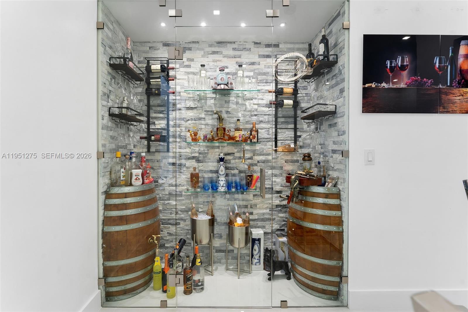 This beautifully updated pool home features sleek white porcelain tile flooring throughout and soaring high ceilings. The centerpiece of the home is a glass-enclosed wine cellar, ideal for showcasing your collection as well as the kitchen which ties up the space perfectly with extra high cabinets and island great for entertaining. High-impact windows and doors throughout the home create a space with lots of sunlight to enter the home. Outside, enjoy a the heated pool on a cool deck surrounded with high quality pavers, an outdoor kitchen area for gatherings, and a cabana bath for convenience. Plus, with double-wide gated side access on both sides, there’s ample space for your RV or boat. This is the ultimate blend of style, function, and outdoor living!
