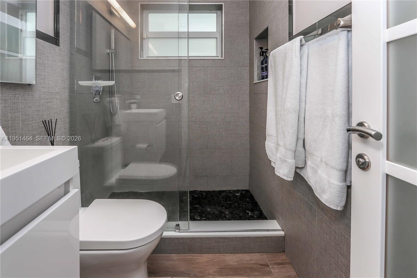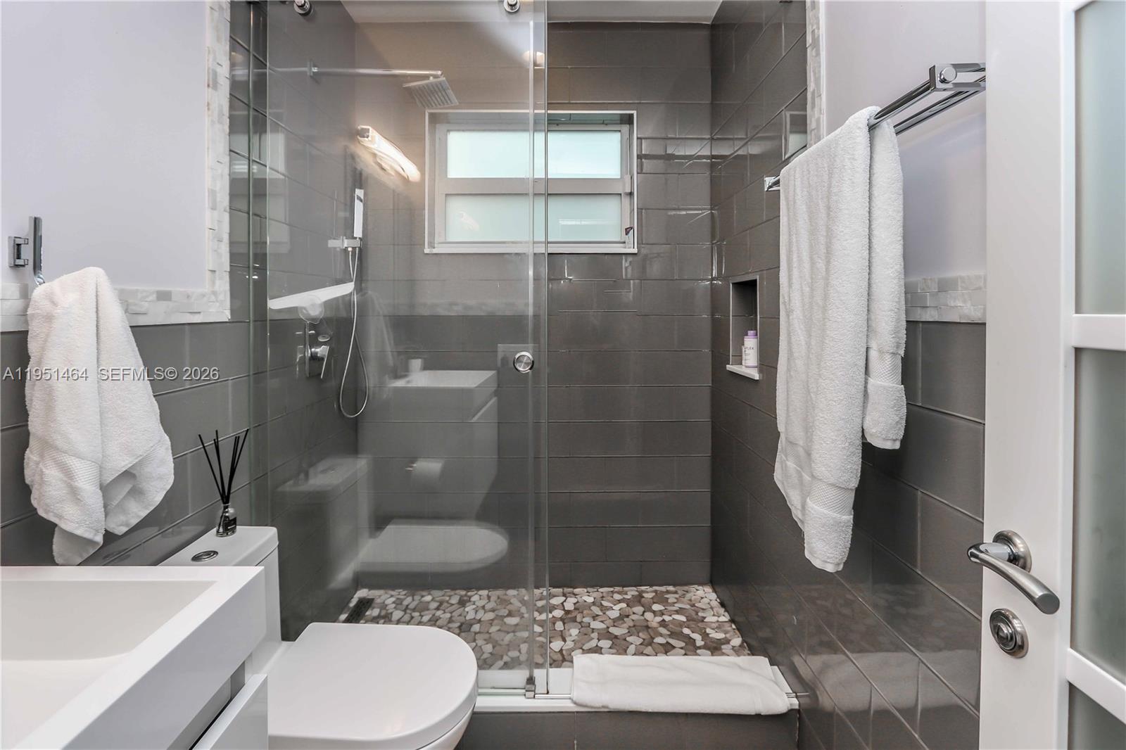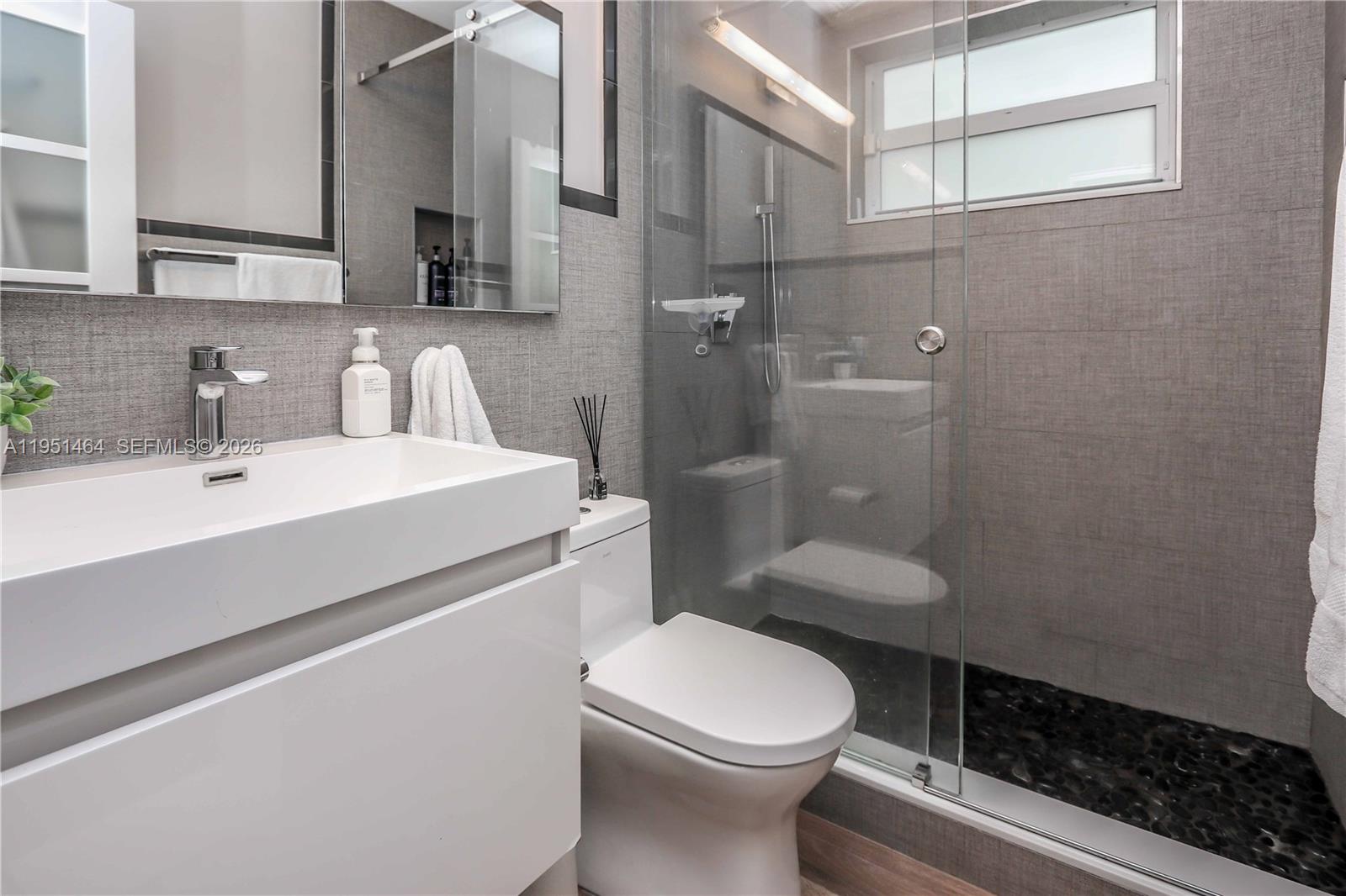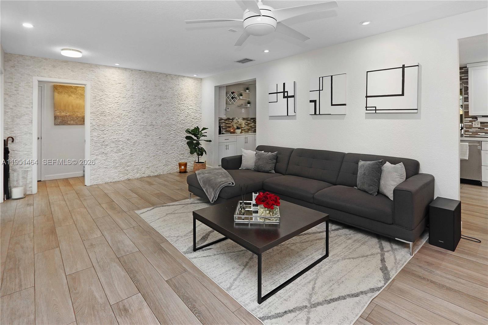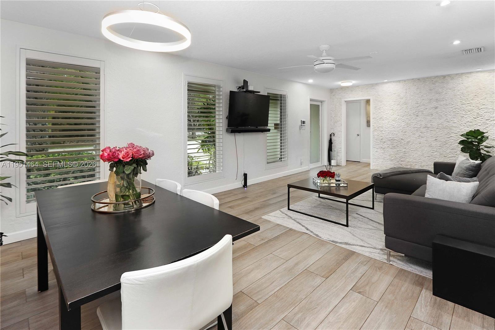 Beautifully updated 3-bedroom, 2-bath home with an additional room, currently used as a 4th bedroom, located in the highly desirable Hollywood Lakes neighborhood and directly across from a park. Thoughtfully designed with a split floor plan, this home features a spacious living and dining room combination that flows seamlessly into the open kitchen—ideal for everyday living and entertaining. The oversized kitchen is a standout, offering a large island with prep area, white shaker cabinetry, white quartz countertops, mosaic tile backsplash, recessed lighting, and an open connection to the formal dining space. Additional highlights include impact windows and doors, plantation shutters, newer custom interior doors, a glass front door entry, tankless water heater, and a spacious laundry room. The primary suite boasts a large closet with a glass panel door and a modern bath with floating vanity and glass-enclosed shower. A secondary bathroom features glass tile, stone flooring, a floating sink, and a glass shower enclosure. Step outside to enjoy the oversized covered and screened patio, perfect for entertaining year-round. Completing the home is a grass/paver 2-car driveway and an unbeatable location in one of Hollywood’s most sought-after neighborhoods.