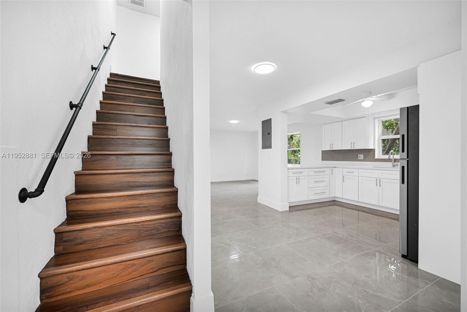 Welcome home to this beautifully remodeled and upgraded 4-bedroom, 2.5-bath residence offering 1,840 total sq ft, tucked away on a quiet cul-de-sac for added privacy. Enjoy peace of mind with hurricane impact windows and sliders (2025), a newer HVAC (2024), and the convenience of an in-unit washer & dryer. The renovated open-concept kitchen features quartz countertops, shaker cabinets, modern finishes, and Samsung appliances including stove, microwave, refrigerator, and dishwasher—perfect for both everyday living and entertaining. Ceramic tile flooring runs throughout the main level for easy maintenance, while laminate wood flooring adds warmth upstairs. The spacious layout includes a large living room, storage room, and dedicated laundry area. One oversized bedroom is located downstairs, ideal for guests, a home office, or multi-generational living. Upstairs, the primary suite offers a generous walk-in closet and a beautifully updated ensuite bath with a frameless glass shower. The second full bathroom includes a tub for added functionality. Step outside to a fenced private backyard with endless potential—create your dream outdoor oasis with space for a patio, play area, garden, and more. Fee simple ownership with NO HOA, making this an excellent opportunity for first-time buyers, homeowners, or investors. Conveniently located near schools, shopping, dining, and major roadways.