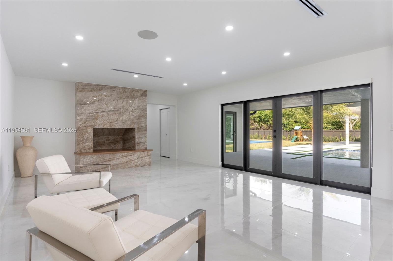 Welcome to an extraordinary residence where contemporary design meets unparalleled outdoor living — a sanctuary reimagined from top to bottom on an expansive corner lot. Fully remodeled with no detail spared, this home offers a rare blend of refined interiors and unmatched outdoor living, setting a new benchmark for luxury in the area. The home makes an immediate impression with all-new Low-E impact windows and doors, enhancing both aesthetics and energy efficiency while flooding the interior with natural light. Inside, expansive living areas are unified by 48×48 Spanish porcelain tile, creating a clean, contemporary canvas throughout. The heart of the home is a designer kitchen and living space finished with Taj Mahal quartzite countertops, offering timeless elegance, durability, and visual warmth. Every space has been thoughtfully reimagined to maximize flow, comfort, and functionality. Designed for elevated entertaining and everyday enjoyment, the property opens to a private outdoor oasis that includes a heated smart pool and jacuzzi with app-controlled functionality, a custom pickleball court with professional lighting, and an exterior cabana equipped with a Summerset BBQ and premium appliances delivering a true resort-style experience at home. Manicured landscaping is supported by a sprinkler system. Additional features include a 2-car garage, integrated whole-home audio system, and a modern camera security system.