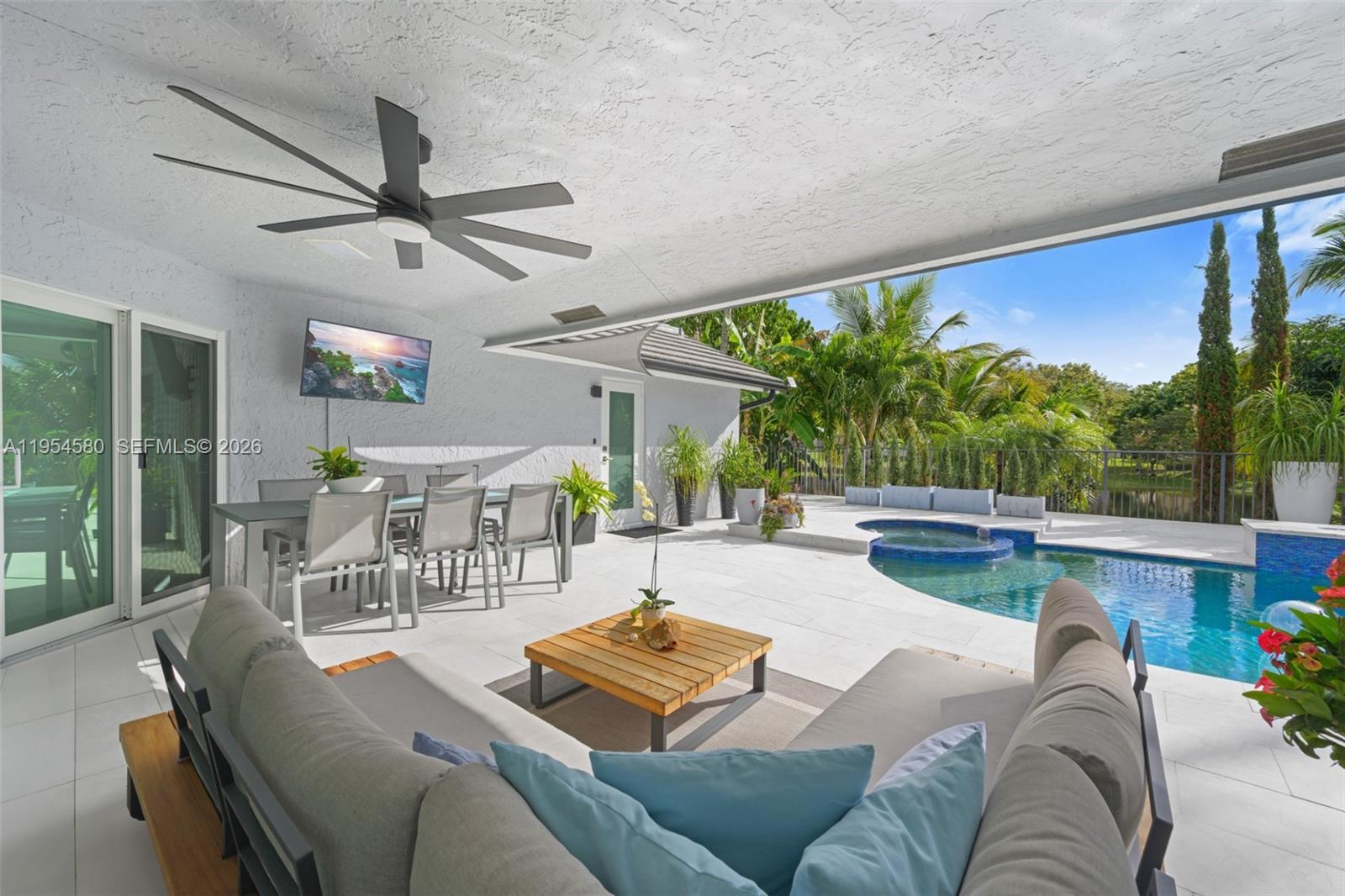 Experience modern luxury 3BEDROOMS + DEN contemporary home WITH FURNITURE INCLUDED located in the prestigious, guard-gated community of Sunset Springs.Waterfront masterpiece is defined by high-end finishes, including porcelain tile flooring, upgraded designer lighting & Custom interior accent walls.European-style kitchen and expansive open-concept living areas are bathed in natural light, perfectly complemented by integrated motorized window treatments throughout. Spacious master, featuring a spa-like bath with his-and-her vanities, a soaking tub, and shower, all with direct access to the pool and gardens. Step outside to an entertainer’s paradise.Upgraded patio boasts a professional-grade summer kitchen with a BBQ, bar, and wine fridge, plus dual fire features overlooking a heated saltwater pool and jacuzzi. Lot is a private tropical orchard, featuring Mango, Fig, Papaya, and Avocado trees, all beautifully illuminated by custom LED accent lighting. The home features hurricane impact windows (4y old),new flat tile roof with matching gutters (2y old), and a new A/C unit (2.5y old). Sustainable living is effortless with a full solar system and an EV charger located at the garage , which also includes custom storage and a secondary refrigerator. located in a secluded pocket of Weston, this residence is minutes from A+ rated schools and the world-class dining and shopping.This is more than a home; it is an unbeatable lifestyle in one of South Florida’s most desirable communities.