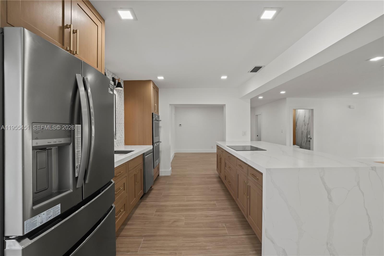 Fully renovated home with fully fenced pool in coveted Imperial Point! Features (wood-look) tile flooring throughout, impact windows and doors, tankless water heater, and electric toilets in all bathrooms with brand new doors on the entire house, yes even the closets! Open-concept living area with custom SOLID-WOOD kitchen, Calcutta Gold countertops, double wall oven, and ample cabinetry—ideal for everyday living and entertaining. Smart light switches in all 4 bedrooms and living room. Primary suite with dual walk-in closets and bathroom with tub. Additional upgrades include recessed lighting throughout and new electrical panel. Double garage plus parking for 6+ vehicles. Conveniently located near shopping, the beach, and Las Olas Boulevard. Perfect for family living.