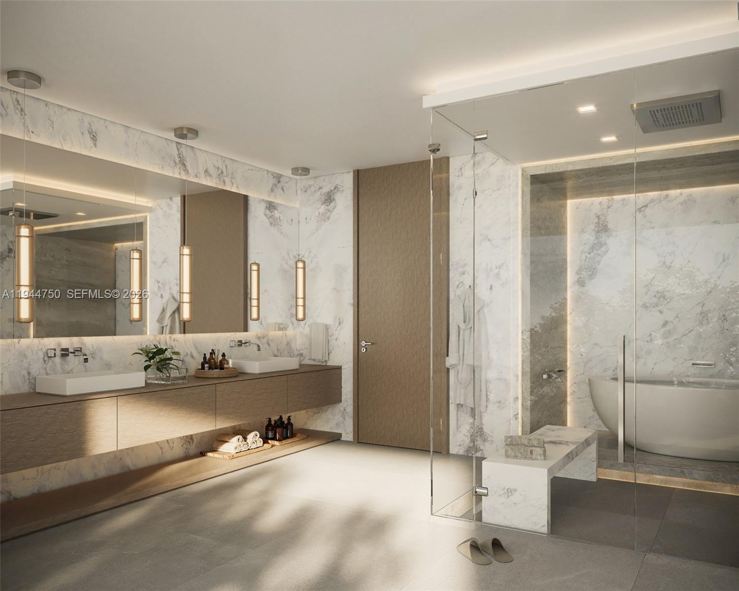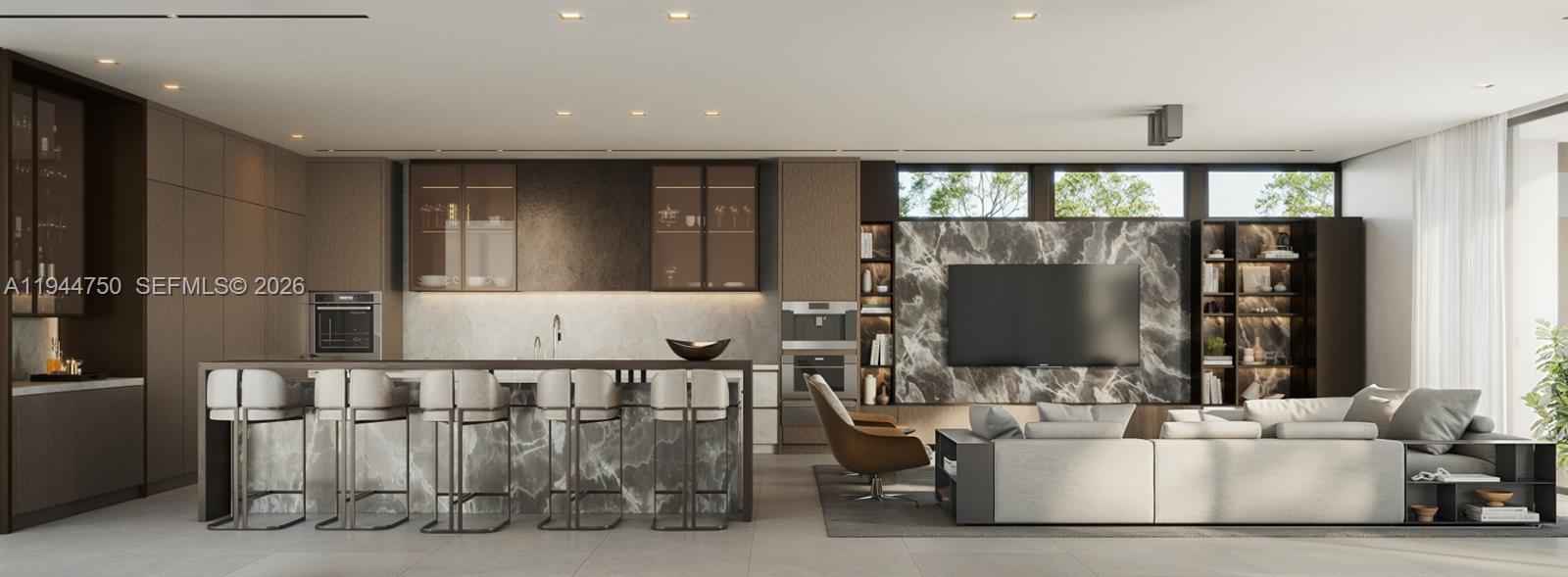 Luxury waterfront home being built with dramatic evening views of the Miami Beach skyline. Designed by Praxis Architecture, this 5 bed 5 and 1/2 bath home has 5,400 sq foot of living space under AC, with an additional 2,600 sq foot of understory with 9 foot height clearance for parking 5 cars, gym, storage area, games. Open floor plan with sliding telescopic doors for effortless indoor-outdoor living. Expansive primary suite includes a private covered patio. Featuring exquisite French oak flooring, marble bathrooms, this home offers a refined blend of elegance and functionality. The property boasts a covered summer kitchen, pool, dock with lift, and a rooftop terrace providing uninterrupted 360-degree views. Completion expected winter 2026.