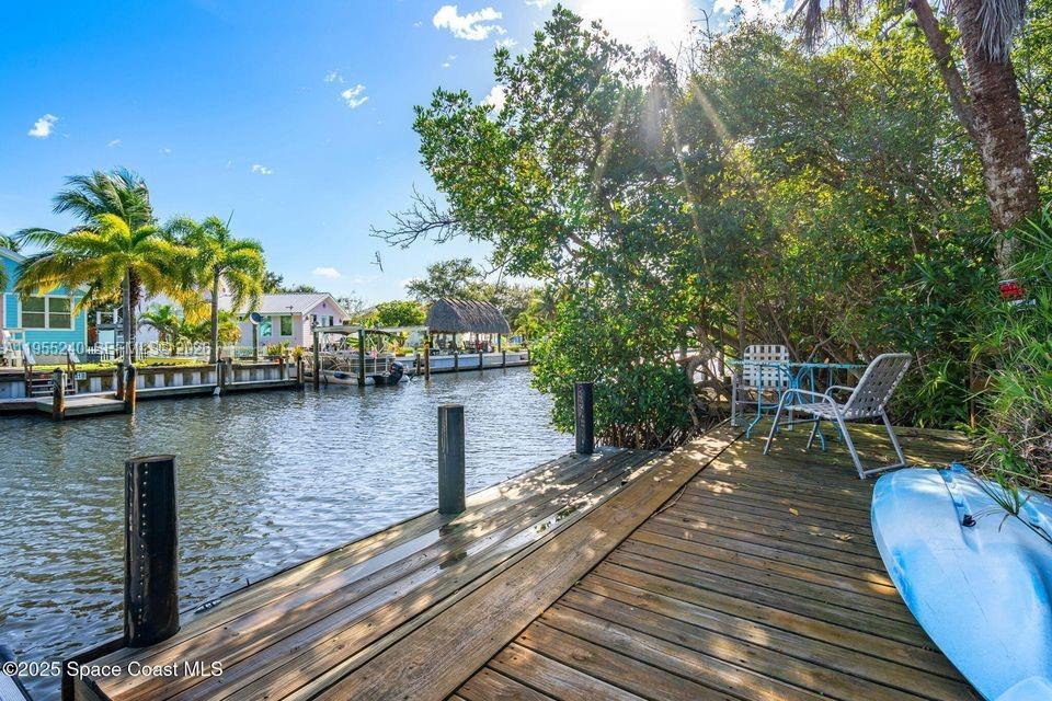 Escape to VIP Island, a one-of-a-kind waterfront community only accessible by boat! This two-story island retreat sits on a double lot with 100 feet of water frontage, private dock, and seawall, ideal for fishing, kayaking, or watching dolphins glide by. Relax in your hammock on the large, covered patio or enjoy sunrise and rocket launches from the upstairs balcony. The home offers a private guest suite downstairs with full bath, and upstairs an open kitchen, dining, and living area with vaulted ceilings, two bedrooms, a full bath, and a spacious loft with endless possibilities. Entertain under the outdoor gazebo or plan your future resort-style pool with room to spare. Just 5 miles south to ocean access through Sebastian Inlet and 15 minutes by boat to an uncrowded beach. Whether a weekend escape or full-time home, this is Florida island living made simple. Schedule your private island tour today!