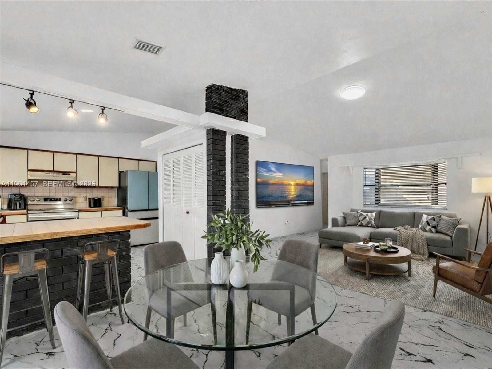 Incredible opportunity to own this charming 2 bedroom, 2 bathroom home on a spacious corner lot located in the heart of Port St. Lucie. This pristine property was recently renovated with porcelain tiles throughout and updated master bathroom. An open kitchen, adjacent to a large dining room, with a new Samsung refrigerator and garbage disposal, recently installed. A split bedroom layout with spacious walk-in closets and plenty of storage room. The fencing was just replaced along with a new flat roof. It features an oversized covered patio with a pass through bar top, giving you that great feeling for relaxation and entertaining your family and friends.