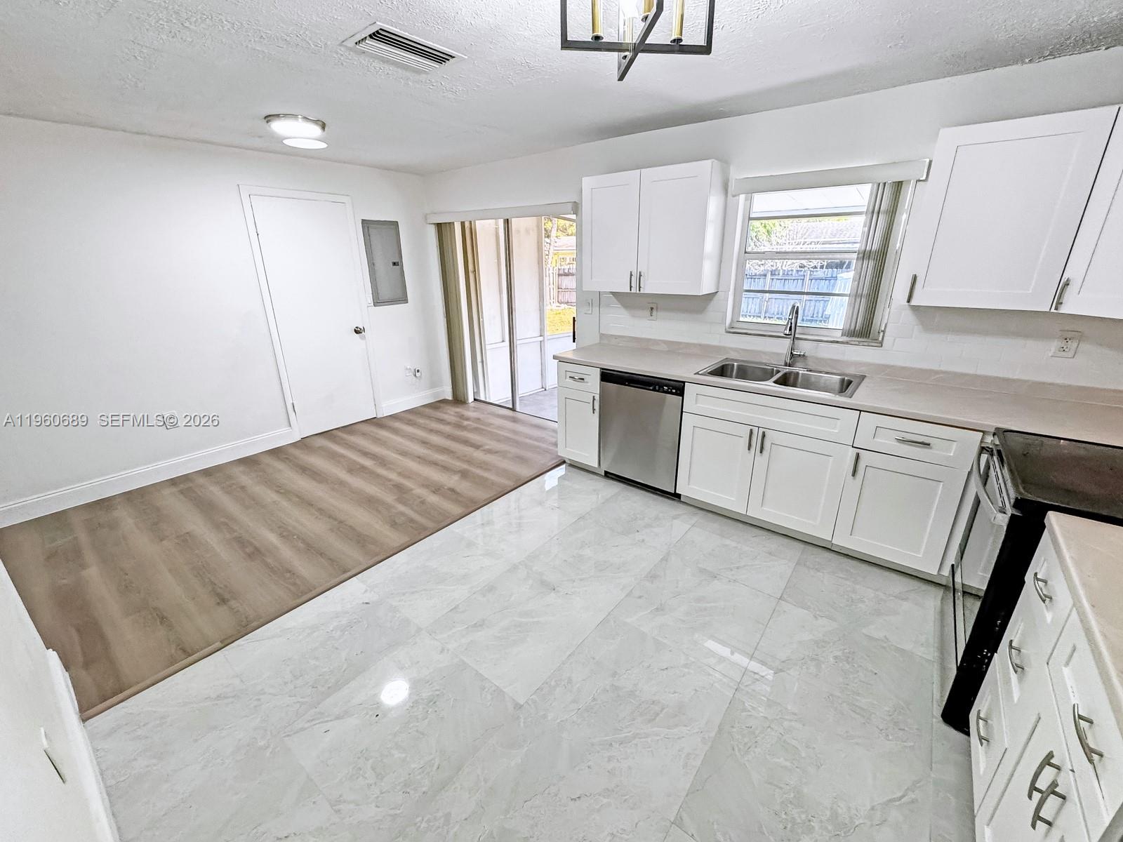 This single family home offers 3 bedrooms and 2 bathrooms and features a newer roof installed in 2024, brand new wood style laminate floors in the living area and an updated kitchen with white shaker cabinets and stainless steel appliances. The interior is enhanced with tasteful, lighting fixtures and ceiling fans giving the home a modern look. The home has been freshly painted inside and out and has great curb appeal from the outside and a light and bright feel on the inside. The living area is completed with a large picture window that allows for lots of natural light to flow in, a perfect space for reading your favorite book or watching the world go by. The home features accordion shutters for added storm protection and peace of mind. Situated on a spacious fenced lot the property includes a screened patio a walk in storage shed and plenty of yard space with room to add a pool. Recent updates include a new AC system installed in 2021 and a water heater installed in 2022. Conveniently located near dining shopping entertainment and parks.