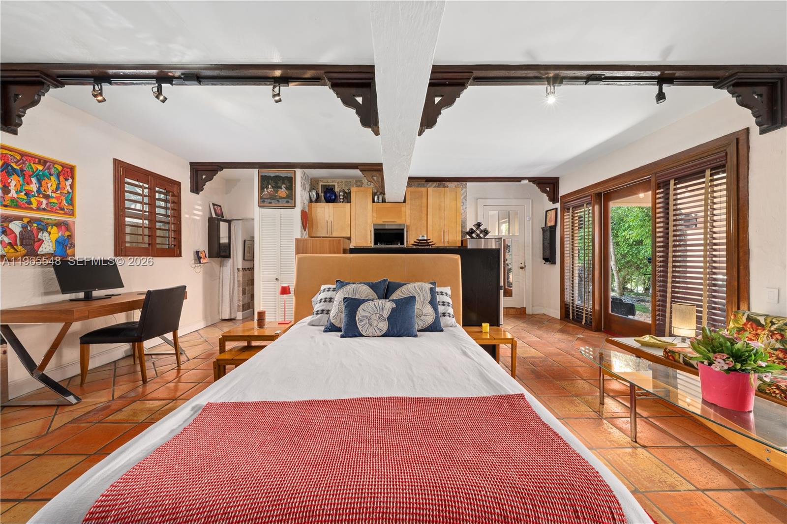 Chic, gated carriage house, Mediterranean style on a private expansive corner lot in the heart of Miami Beach. Fully enclosed by tall hedges and wrought iron gates, this one-of-a-kind property offers exceptional privacy, one block from the beautiful PineTree Dog Park, just a few blocks from the ocean and four blocks from shopping, dining and houses of worship. Minutes away from La Gorce Country Club and Miami Beach Golf Club. The residence features warm architectural details, terracotta floors, wood shutters, a charming fireplace, and seamless indoor–outdoor living. Two renovated kitchens, positioned on separate levels provide rare flexibility for entertaining, extended family, or private guest accommodations. Large living room upstairs with two bedrooms (one is used as a closet) full renovated bathroom and kitchen. A fully equipped studio apartment on the lower level offers its own distinct living space, ideal for in-laws, long-term guests, home office, or potential rental income. The lush front garden creates a true private peaceful retreat, showcasing a sparkling heated/cooled pool with fountain, majestic Royal palms, Chicago brick walkways, and a covered patio for year-round outdoor living. Security video cameras. Ideal for end-users or investors seeking flexibility or potential income. A rare offering for buyers seeking timeless architecture, privacy, and a true sense of place in the heart of Miami Beach.