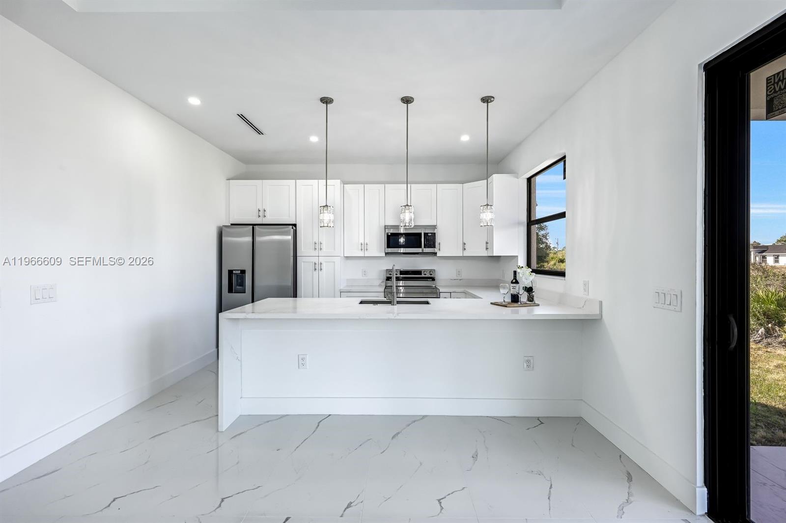 Brand-new construction in Lehigh Acres! This modern 3-bedroom + den, 2-bath home offers an open-concept layout with high ceilings, tile flooring throughout, and plenty of natural light. The stylish kitchen features quartz countertops, stainless steel appliances, soft-close cabinetry, and a large island—perfect for entertaining. The spacious primary suite includes a walk-in closet and spa-like bath with dual sinks and a walk-in shower. In addition, a 2-car garage, impact doors and windows. Situated on a ¼-acre lot with no HOA. Conveniently located near shopping, schools, and major roads. Move-in ready—schedule your showing today!