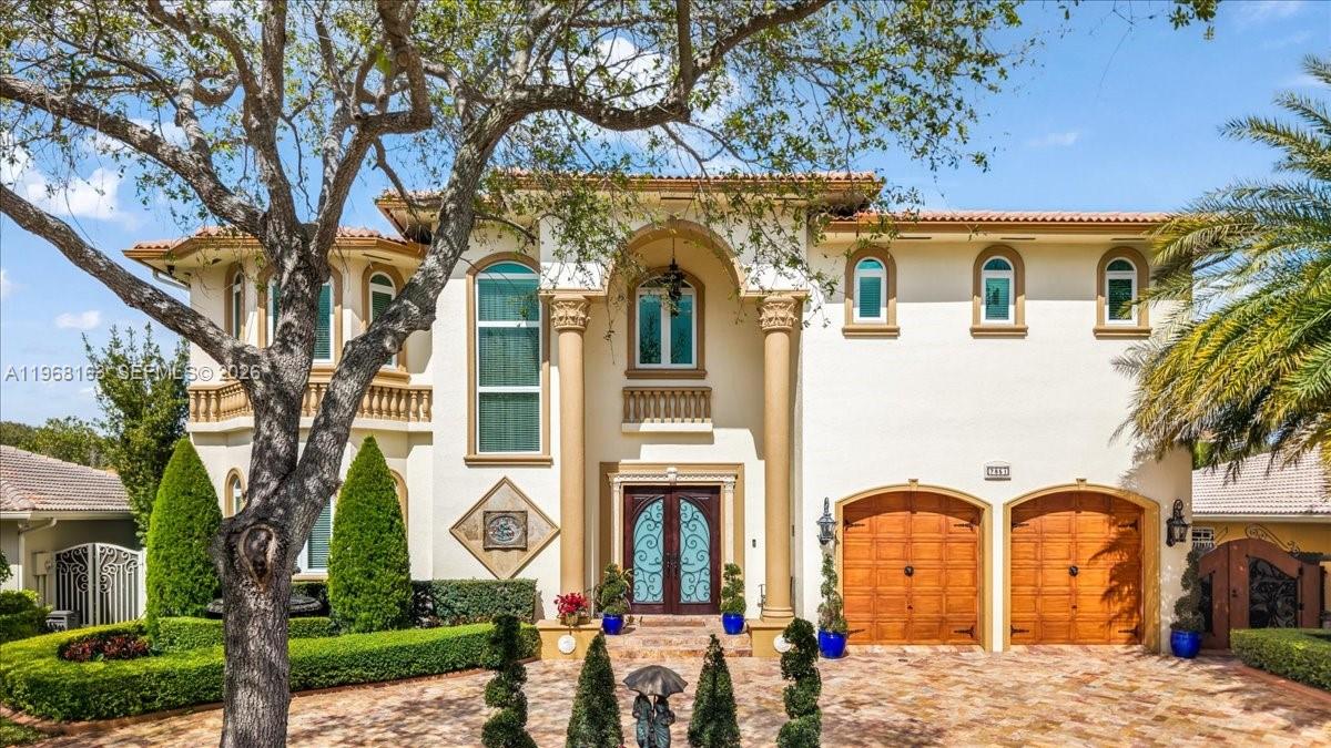 Welcome to this extraordinary custom Mediterranean-inspired estate where timeless elegance, solid construction, and resort-style living converge in one of Miami Lakes’ most prestigious enclaves. Set behind lush, manicured landscaping with a tranquil fountain entry, this 6-bedroom, 5-bath residence spans approximately 4,256 square feet of refined living space, featuring all-concrete construction including the second floor, offering superior durability, peace of mind, and long-term value. From the moment you arrive, the home makes a statement. A dramatic marble-clad grand entrance with a stunning custom medallion welcomes you into soaring spaces accented by classical columns, artistic tray ceilings, and marble flooring throughout, creating an atmosphere of understated luxury and architectural distinction. Interior Highlights Six generously appointed bedrooms, including three guest suites with private en-suite bathrooms A palatial primary suite exceeding 900 square feet, featuring: A spa-inspired bath with Jacuzzi soaking tub Elegant finishes and abundant natural light Custom artistic ceilings in the living room, dining room, family room, and primary suite High-impact windows and doors throughout for security, efficiency, and storm protection Second-floor kitchenette, plus washer and dryer—ideal for extended family, guests, or multigenerational living Oversized two-car garage with marble floors.