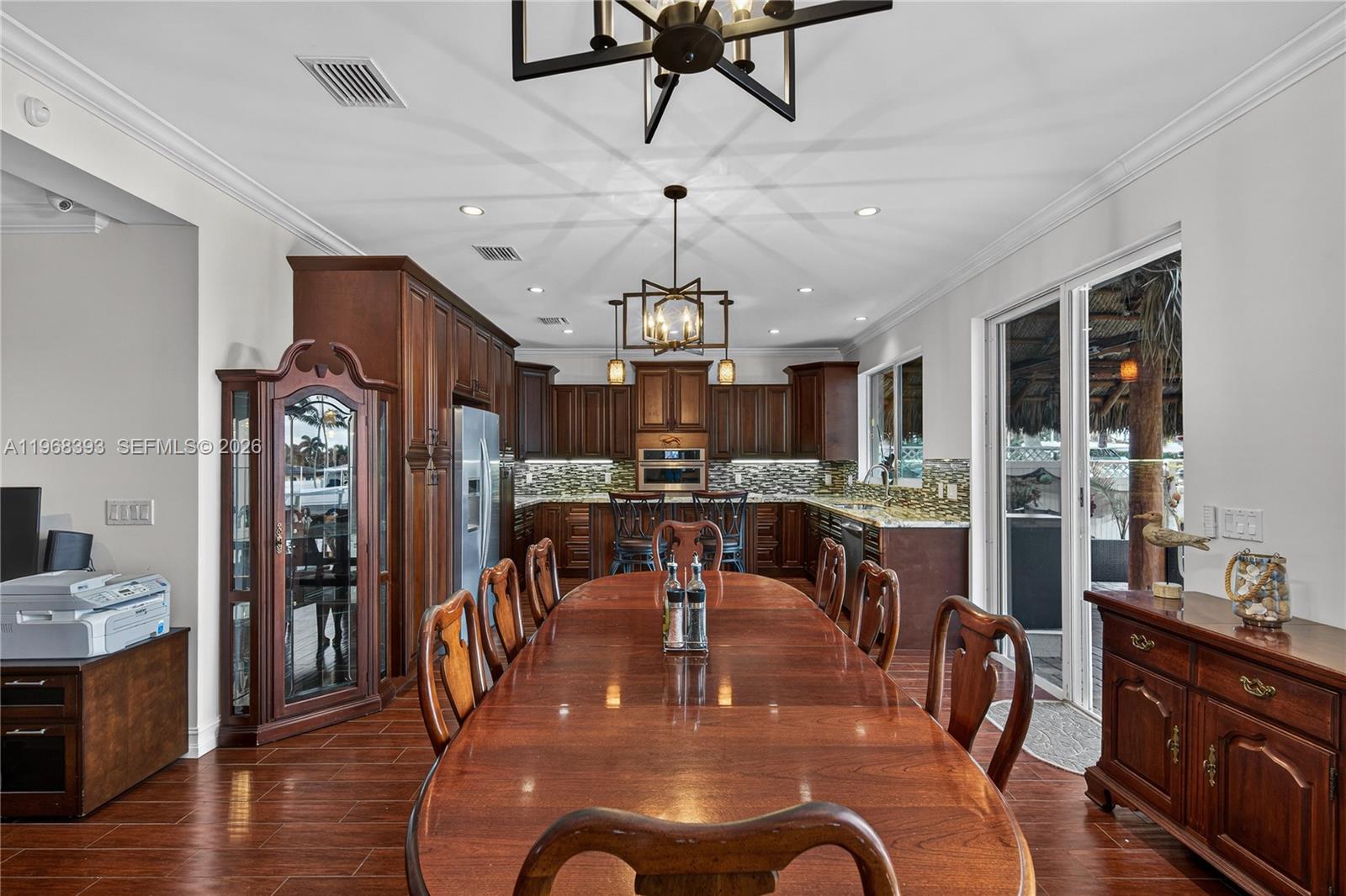 Exceptional wide-canal waterfront residence located at the end of a cul-de-sac in Garden Isles, offering breathtaking water views and outstanding ocean access. This beautifully maintained property features extensive upgrades throughout. Recent improvements include a 2025 metal roof with warranty, significant seawall and dock enhancements, a new floating dock (2025), custom impact windows and doors, PVC plumbing from the home to the street, central vacuum system, full-house generator (excluding A/C), tankless water heater, and professionally designed landscaping. The backyard provides a serene, resort-style setting with a pool, spa, tiki hut, and expansive paver decking—ideal for both relaxation and entertaining. Boasting 70 feet of waterfront on a desirable street within a quiet, family-friendly neighborhood, this property represents an exceptional opportunity. A truly remarkable home that must be seen and will not last!