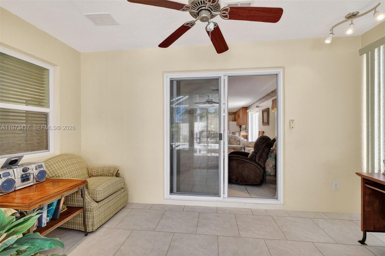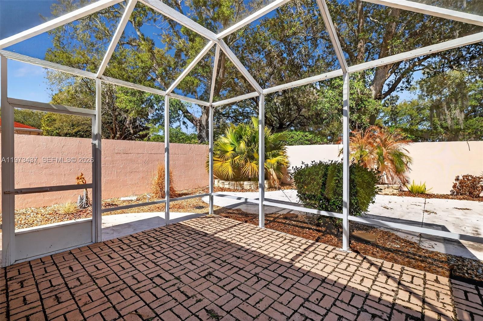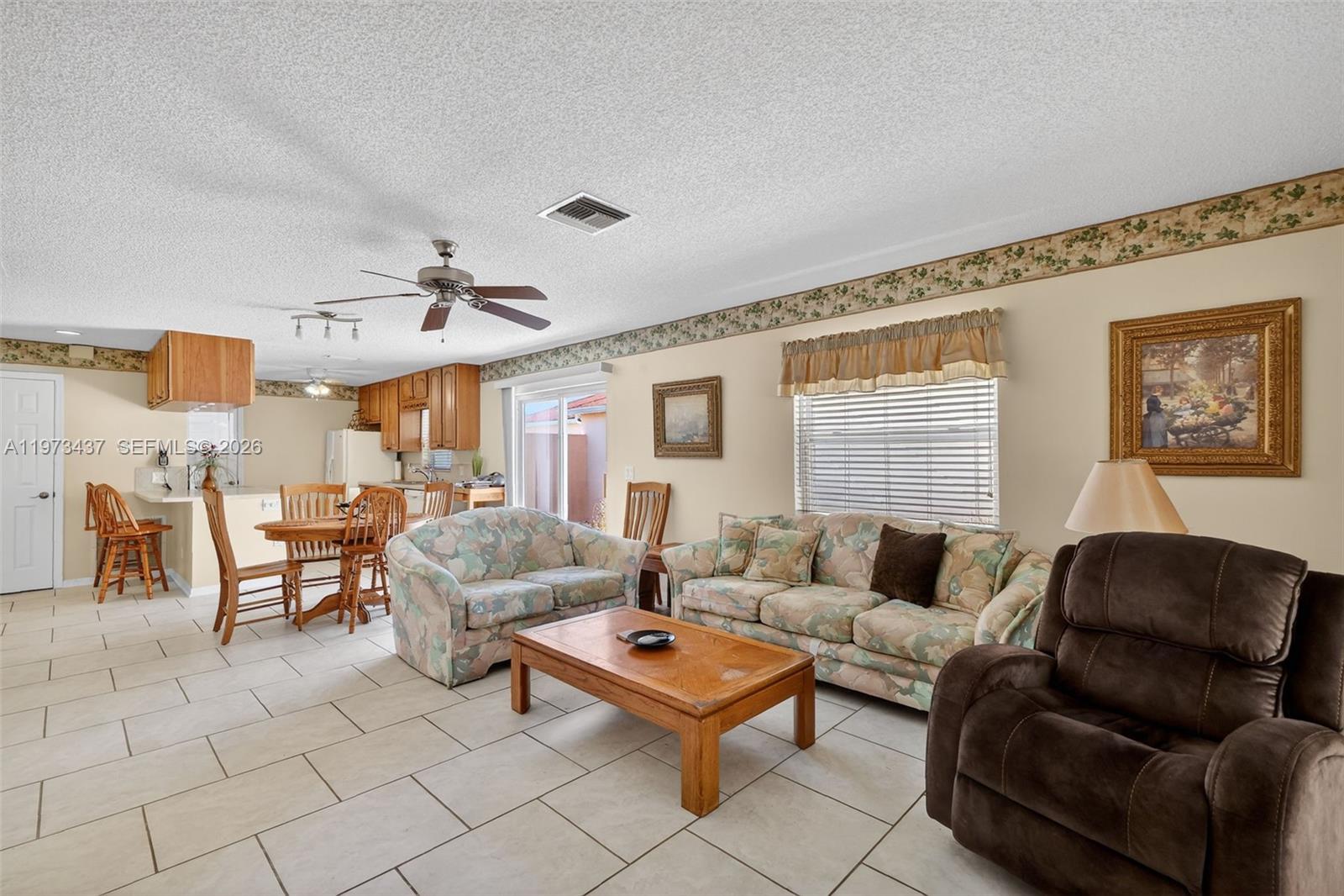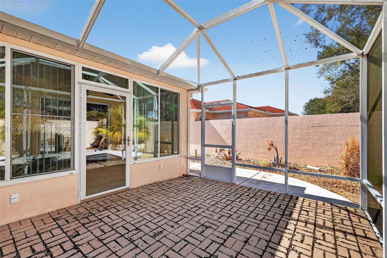 Charming 2-bedroom, 1-bath home just minutes from shopping and only 5 minutes to Spanish Springs Town Square in The Villages. This well-maintained home features an open living and dining area with tile flooring throughout the main spaces and abundant natural light. The kitchen offers ample wood cabinetry, generous counter space, and a breakfast bar for casual dining. Both bedrooms are comfortably sized, with a centrally located bathroom for convenience. Enjoy the enclosed screened lanai and a private backyard with mature landscaping, decorative rock beds, and an extended concrete patio. Ideal as a seasonal retreat, investment property, or full-time residence.