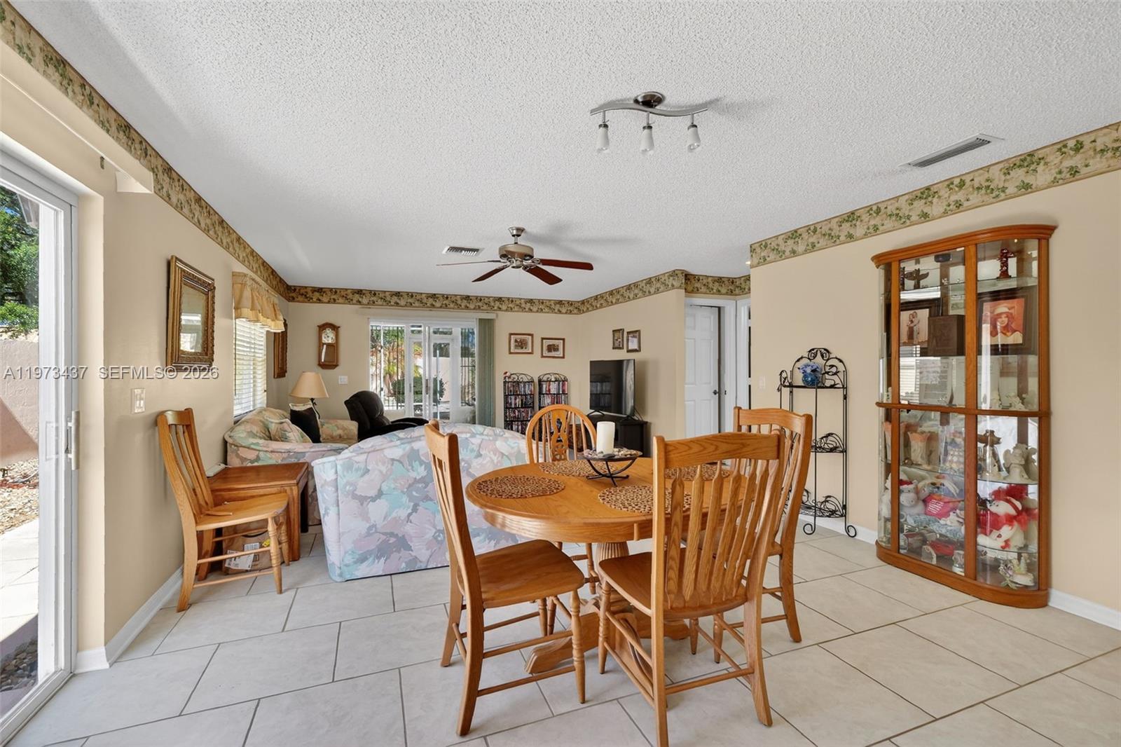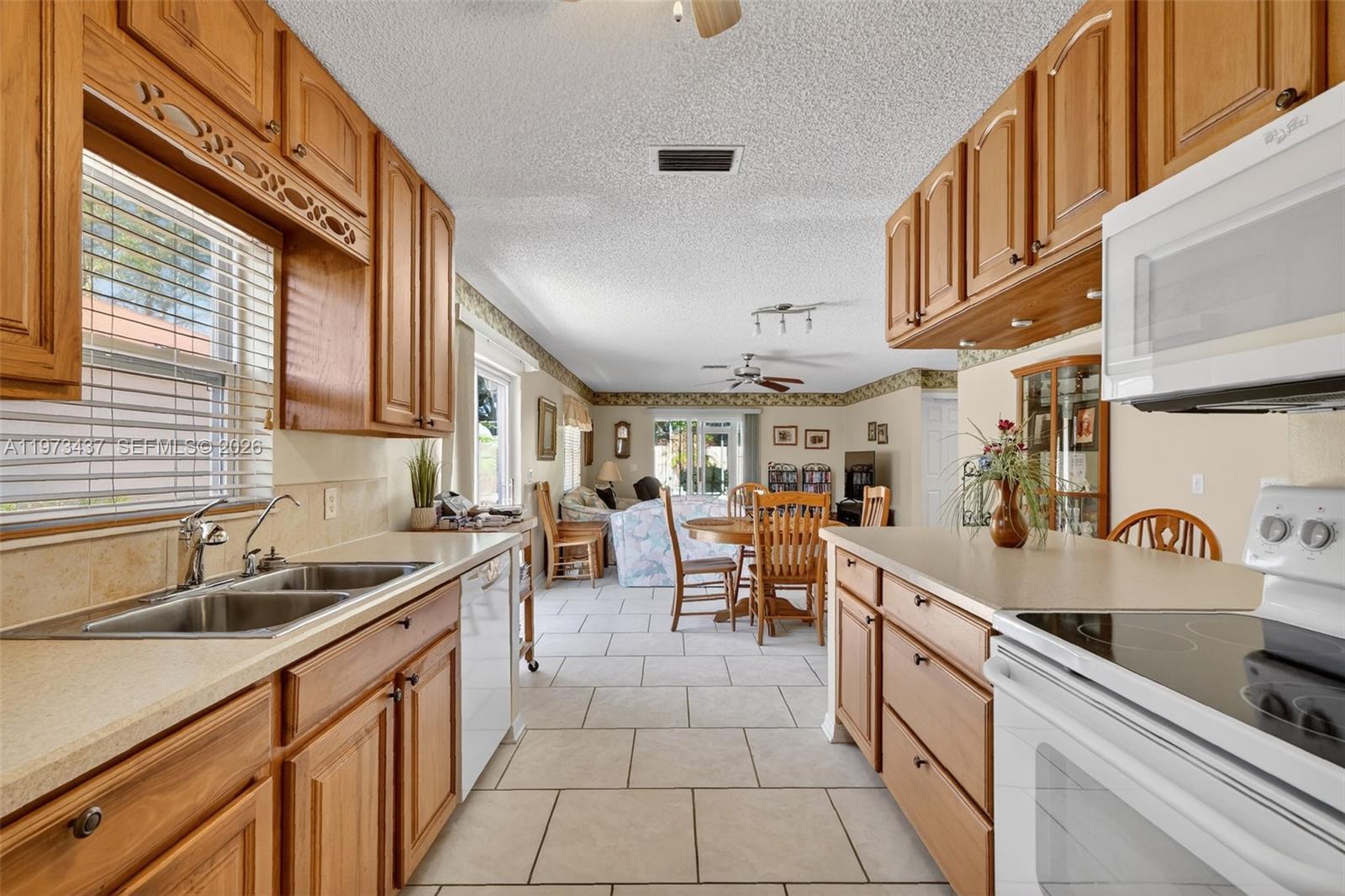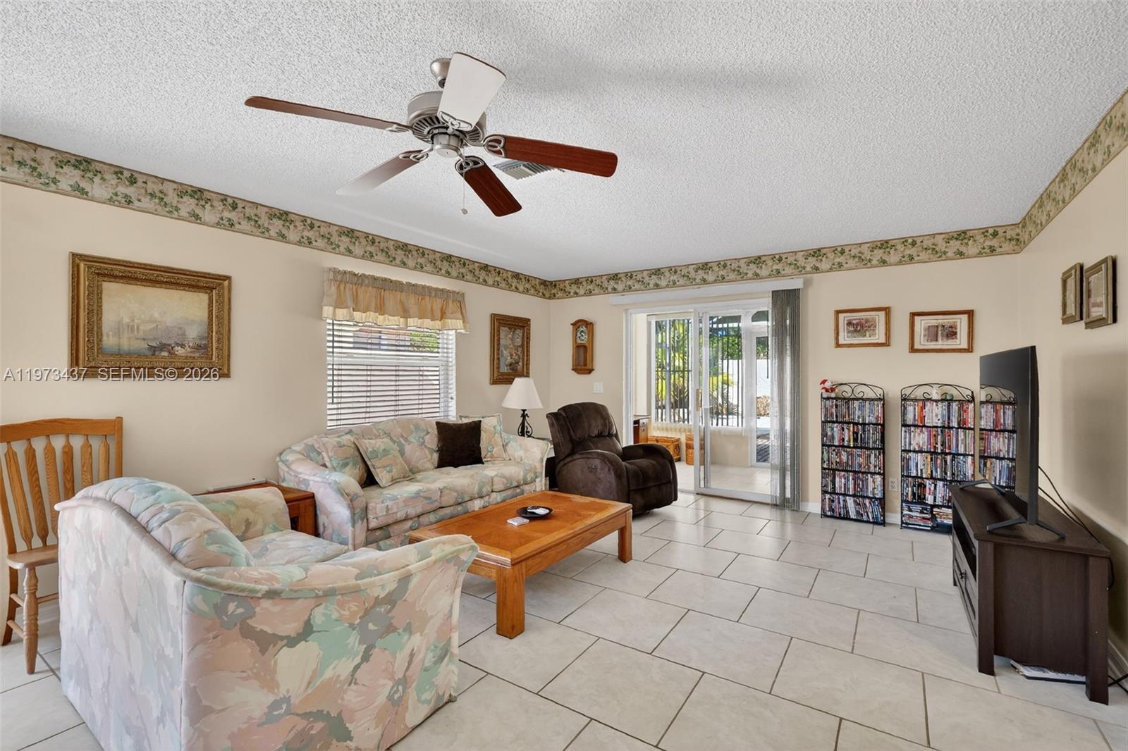 Charming 2-bedroom, 1-bath home just minutes from shopping and only 5 minutes to Spanish Springs Town Square in The Villages. This well-maintained home features an open living and dining area with tile flooring throughout the main spaces and abundant natural light. The kitchen offers ample wood cabinetry, generous counter space, and a breakfast bar for casual dining. Both bedrooms are comfortably sized, with a centrally located bathroom for convenience. Enjoy the enclosed screened lanai and a private backyard with mature landscaping, decorative rock beds, and an extended concrete patio. Ideal as a seasonal retreat, investment property, or full-time residence.