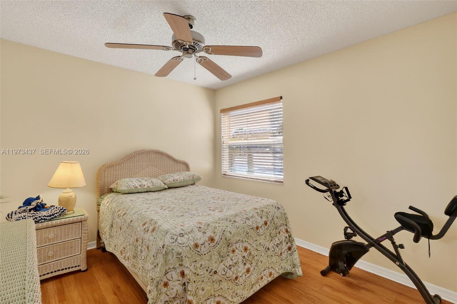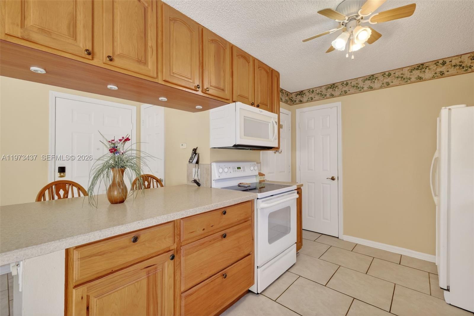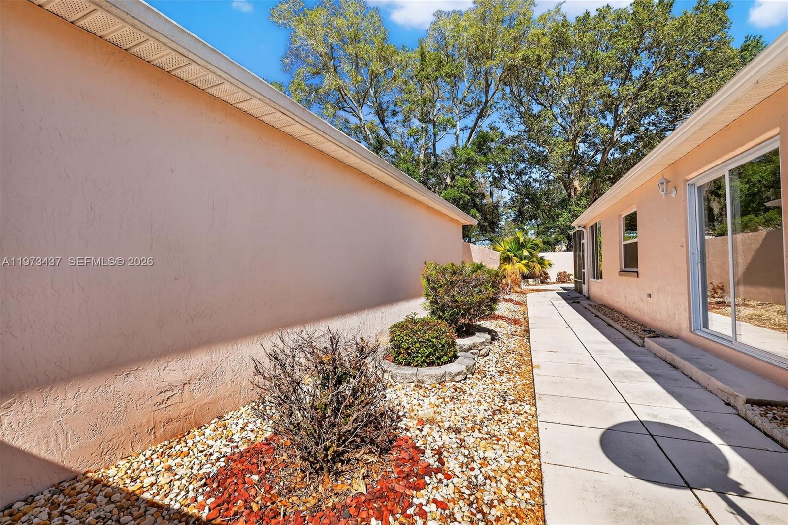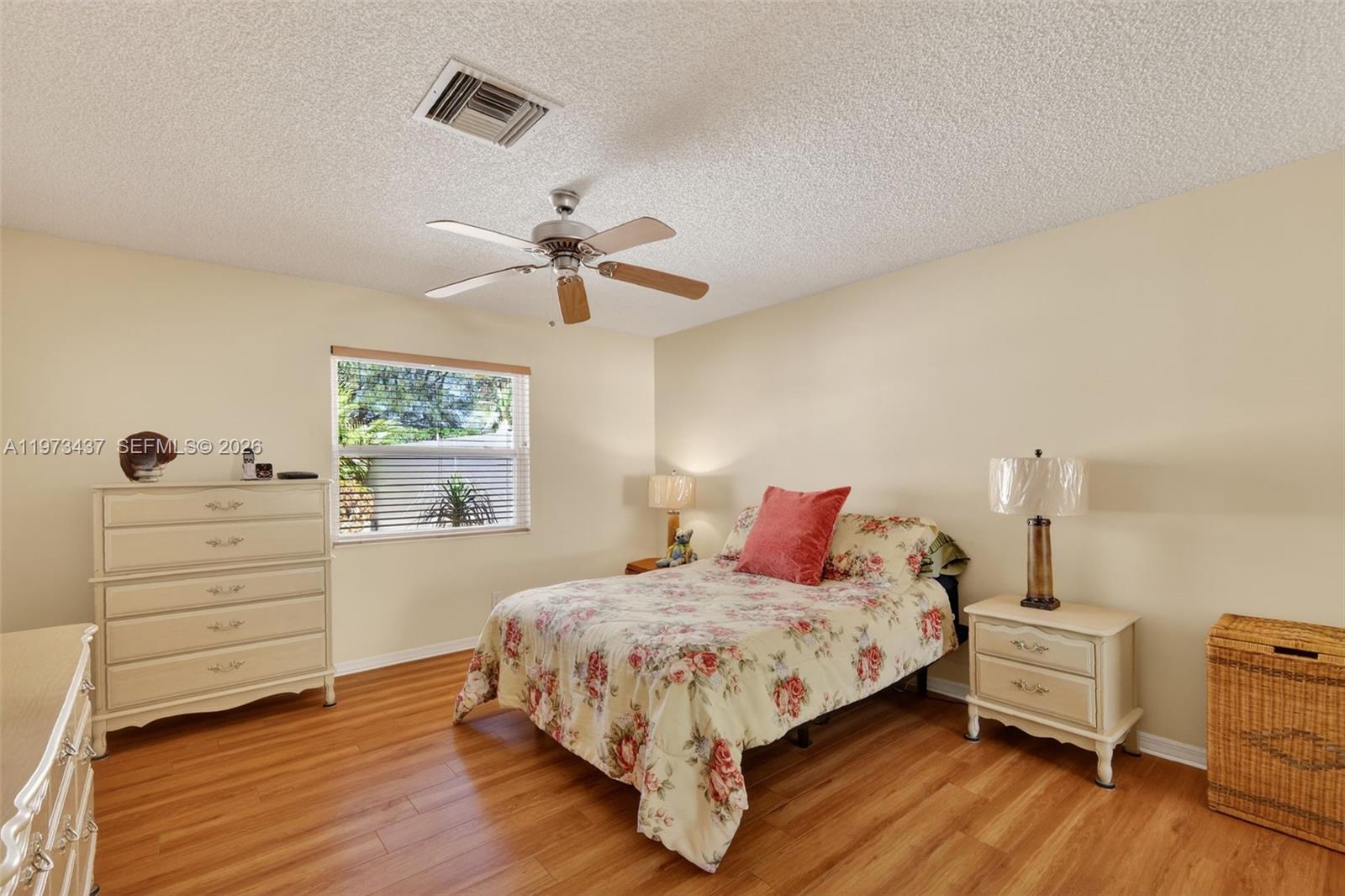 Charming 2-bedroom, 1-bath home just minutes from shopping and only 5 minutes to Spanish Springs Town Square in The Villages. This well-maintained home features an open living and dining area with tile flooring throughout the main spaces and abundant natural light. The kitchen offers ample wood cabinetry, generous counter space, and a breakfast bar for casual dining. Both bedrooms are comfortably sized, with a centrally located bathroom for convenience. Enjoy the enclosed screened lanai and a private backyard with mature landscaping, decorative rock beds, and an extended concrete patio. Ideal as a seasonal retreat, investment property, or full-time residence.
