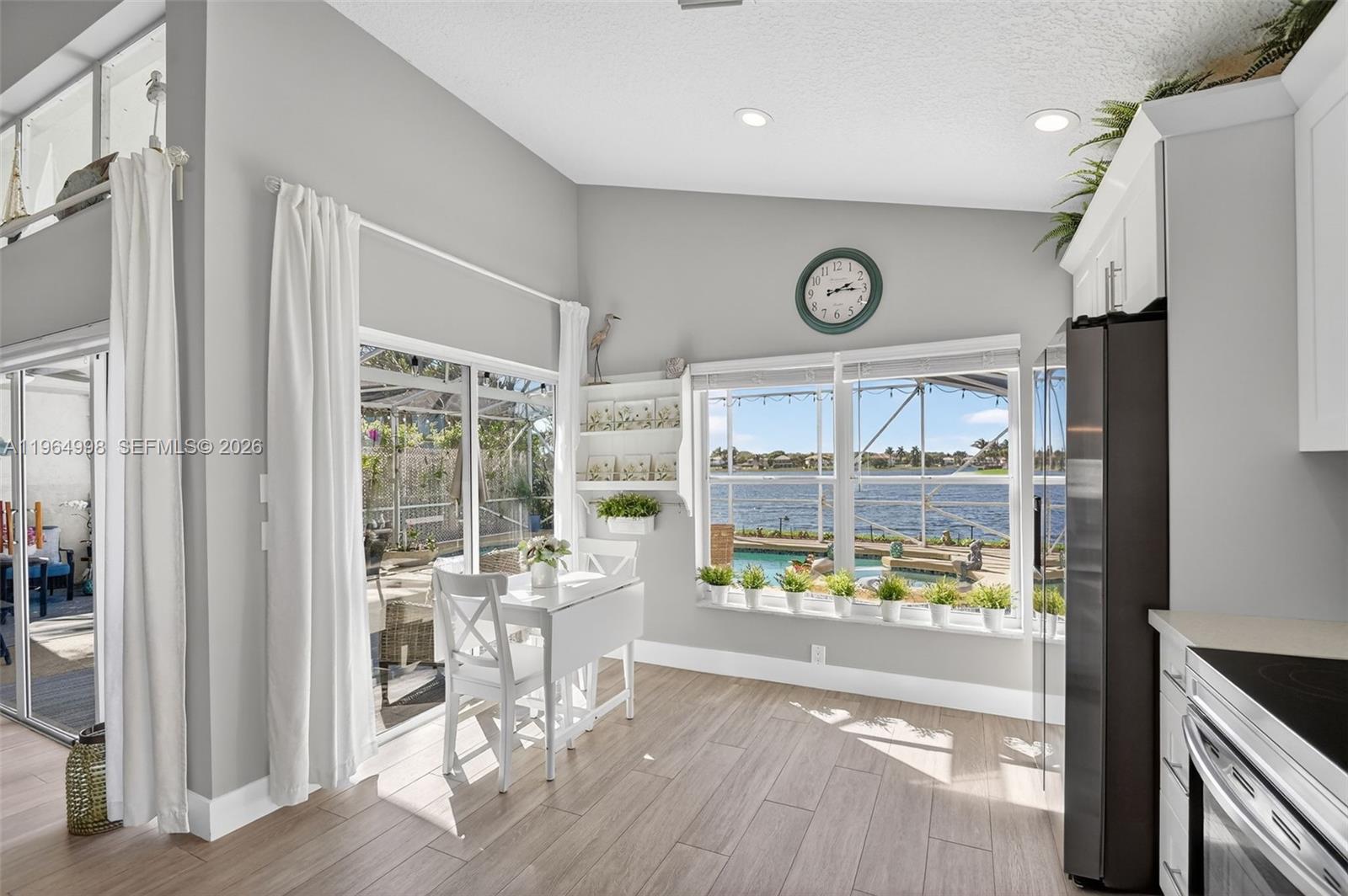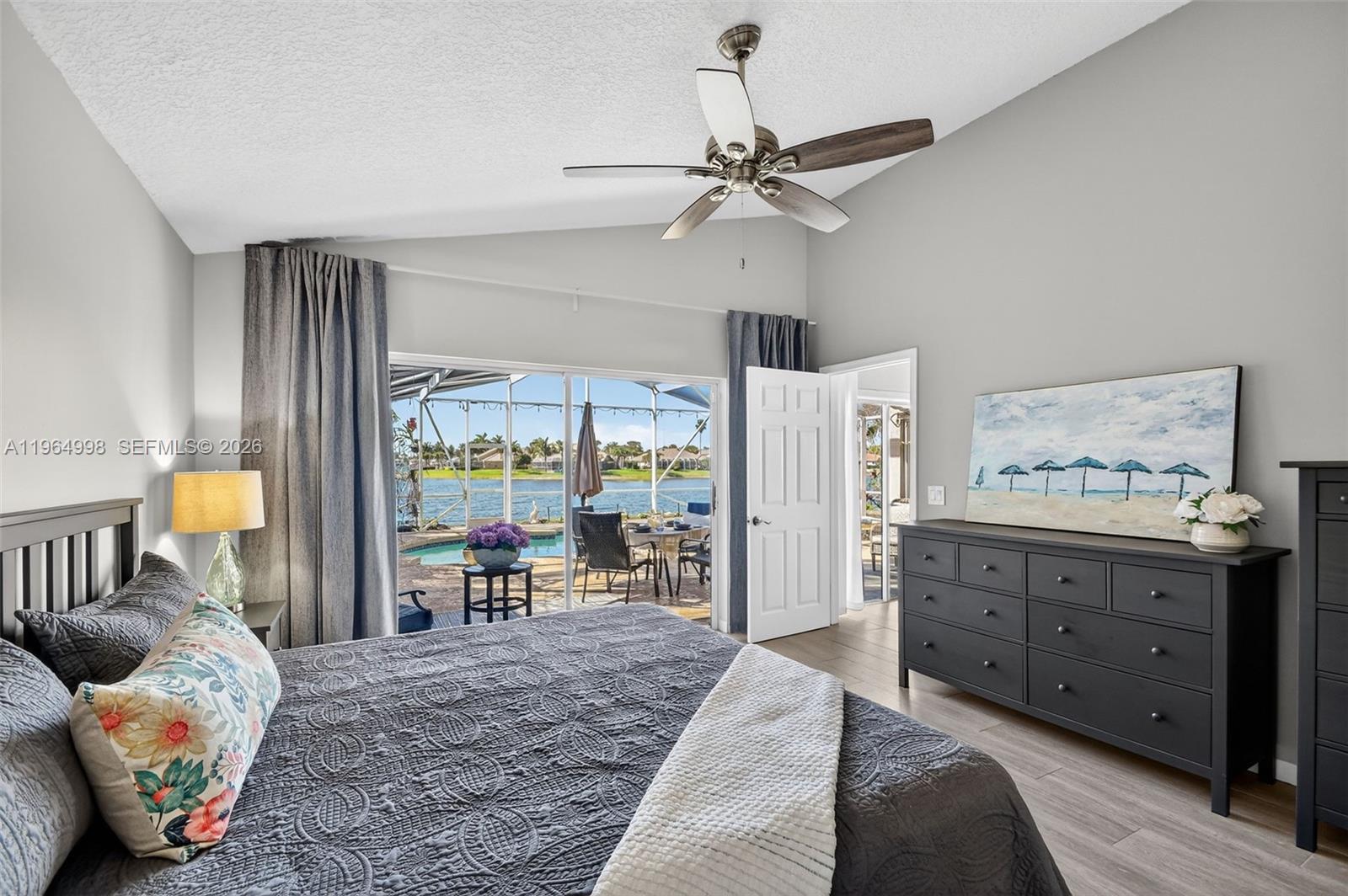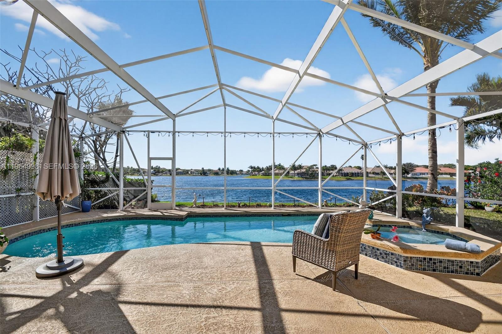 Completely remodeled 3-bedroom, 2-bathroom waterfront single-family home in the highly desirable Lake Charleston community! This beautifully updated residence offers breathtaking water views and unforgettable sunsets. Enjoy true Florida living with a resurfaced saltwater pool featuring a heater and spa with jets, new ceramic finish, screened porch, and child safety fence. The open layout showcases stunning lake views, a modern white kitchen with abundant cabinetry and stainless steel appliances, and a desirable split floor plan. The private primary suite is situated on its own side of the home for added comfort. Additional highlights include a utility room with new washer and dryer, 2-car garage, new sprinkler pump drawing water from the lake, owned solar panels for the water heater, roof (2016), and A/C (2020). Porcelaine flooring throughout and laminated wood floor in the guests bedrooms.Beautiful landscaping surrounds the home, including a striking Sylvester Palm with diamond cut in the front yard. Located on a large lake allowing non-motorized watercraft and battery-powered boats. Residents enjoy a clubhouse with two pools, pickleball, and tennis courts. All ages welcome. Zoned for three A-rated schools. Don't wait, it will be too late!