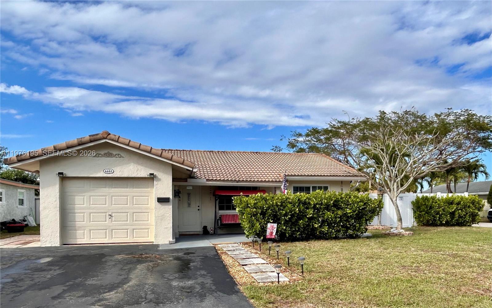 Welcome to this beautifully updated home located in the desirable Vanguard Village in the Mainlands, an all-ages community known for its charm and convenience. Situated on a spacious corner lot, this property offers a large front and backyard, perfect for outdoor living and entertaining. Step inside to find wood laminate flooring throughout the main living areas, an updated kitchen and stainless steel appliances, and renovated bathrooms that add a modern touch. The home also features spacious bedrooms and a versatile flex room ideal for a home office, hobby space, or additional living area. The converted garage with a private entrance offers excellent flexibility and can easily function as a den, guest suite, or fourth bedroom. This home has been thoughtfully upgraded with over $50,000 in improvements, including impact windows, doors, and garage door, fencing, RainSoft water filtration and softener system, Heat Shield insulation, new A/C components and ductwork. Additional features include a barrel tile roof, new appliances, updated blinds, and a portable AC unit that will remain with the property. This move-in ready home combines comfort, upgrades, and flexibility in one exceptional community in Tamarac. Schedule your private showing today.