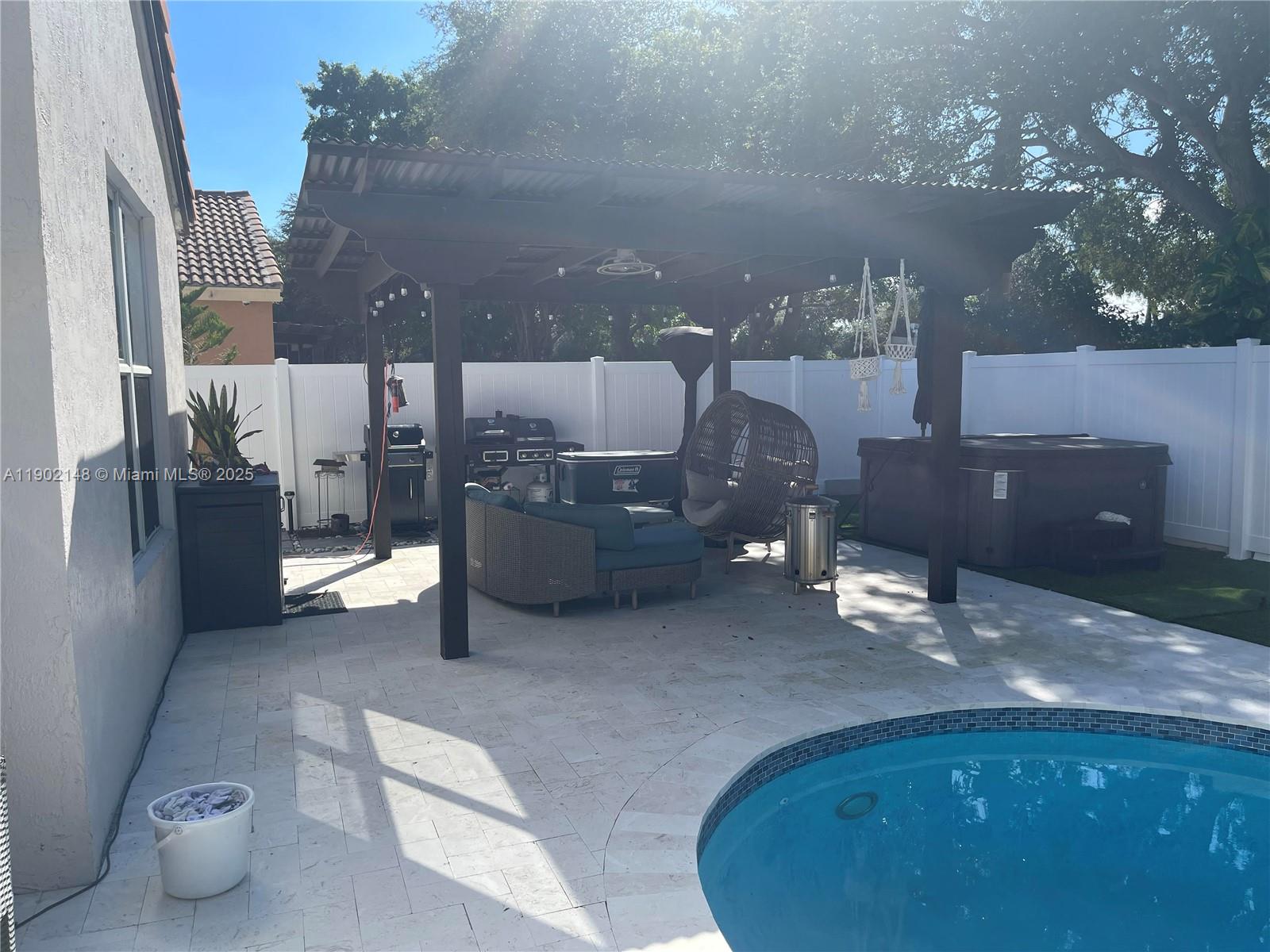 Stunning One-Story Home in the Gated Resort-Style Community of Monaco Cove at Sunset Lakes! Fall in love with this gorgeous 3-bedroom, 2.5-bath residence featuring an inviting saltwater pool and a beautifully designed outdoor oasis perfect for relaxing or entertaining. Enjoy high-volume ceilings and elegant tile flooring throughout. The spacious open-concept kitchen boasts an oversized island with seating, granite countertops, modern cabinetry, decorative backsplash, and stainless steel appliances. The brand-new bathrooms and fresh interior paint give the home a modern, move-in-ready feel. Step outside to your private fenced backyard with a large pergola and sparkling pool — your own tropical retreat. This home truly combines style, comfort, and resort living at its finest.