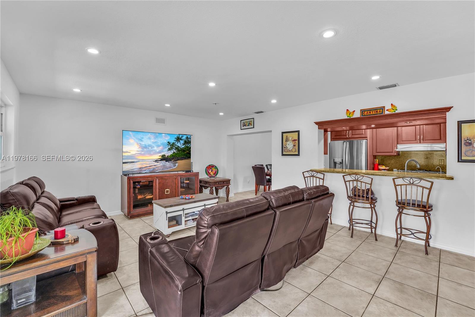Stunningly expanded 5-bedroom, 3-bathroom residence in the desirable Coral Park Estates. This solid CBS-constructed home offers 2,292 sq. ft. of living space, featuring a thoughtful split-plan layout designed for large families. The interior is finished with neutral tile throughout and includes a spacious living room, formal dining, and a sun-drenched family room. The former garage has been seamlessly integrated into the floor plan as a versatile 18-foot flex space, perfect for a home office, gym, or playroom. Retreat to the primary suite featuring a massive walk-in closet and private bath. The highlight of the home is the expansive 30x14 covered rear terrace with a built-in bar, overlooking a fully fenced 7,500 sq. ft