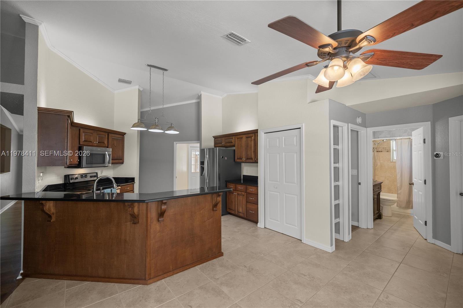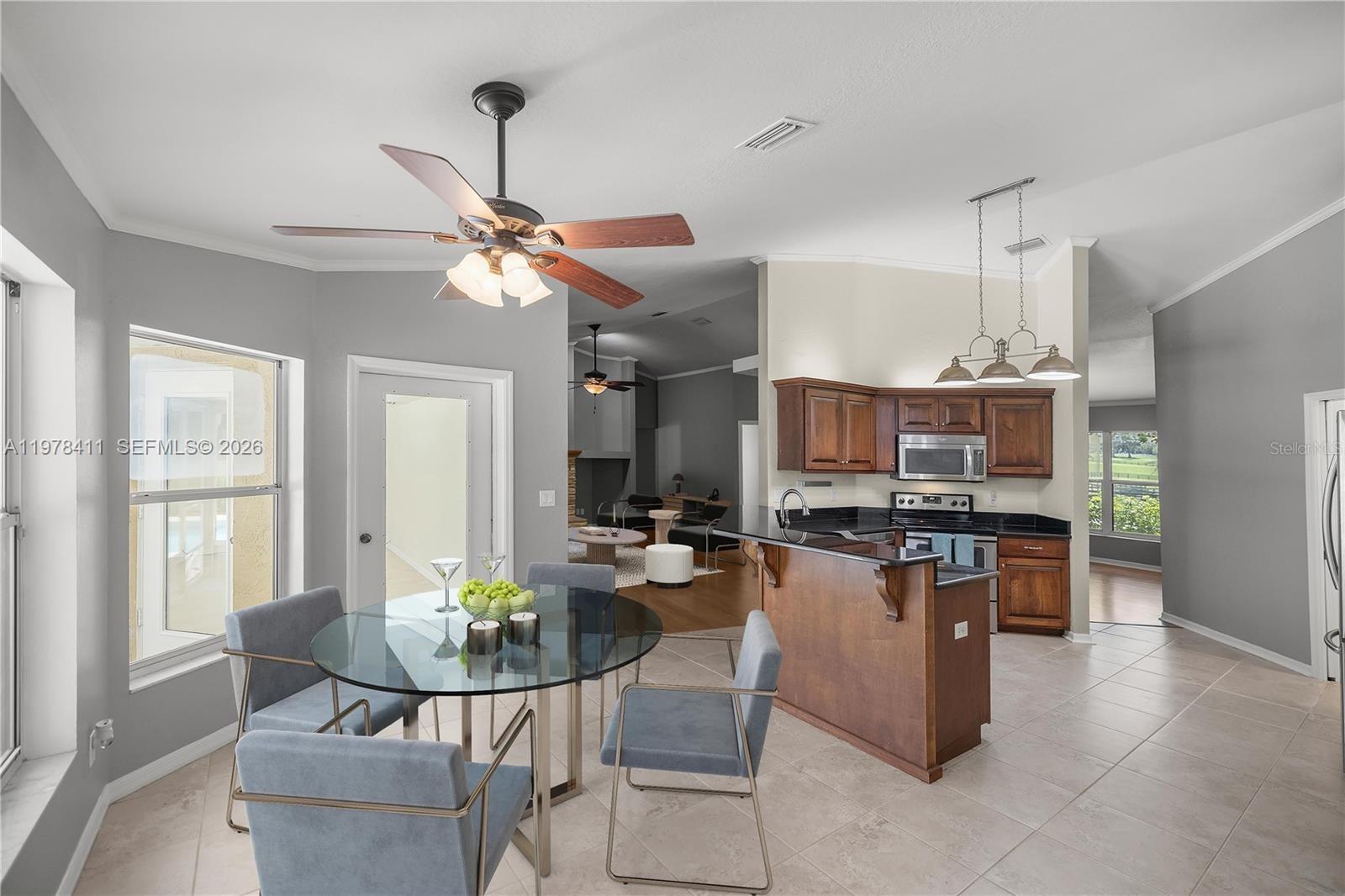 Beautiful 4-bedroom, 2-bath pool home on 1.53 acres with NO HOA located in a highly desirable area of Ocala. This spacious home offers over 3,100 sq. ft. under roof, featuring high ceilings, crown molding, and a cozy fireplace. The split floor plan provides privacy with generously sized bedrooms and a large primary suite with a dual walk-in tile shower. The open kitchen includes granite countertops, wood cabinets, stainless steel appliances, pendant lighting, pantry, and breakfast nook overlooking the lanai and pool. Additional highlights include an additional room, large indoor laundry, oversized screened lanai, and whole-house generator. The A-1 agricultural zoning, fully fenced yard, and private gate make it perfect for animals or enjoying peaceful country living, while still being minutes from the World Equestrian Center, Florida Horse Park, and Downtown Ocala.