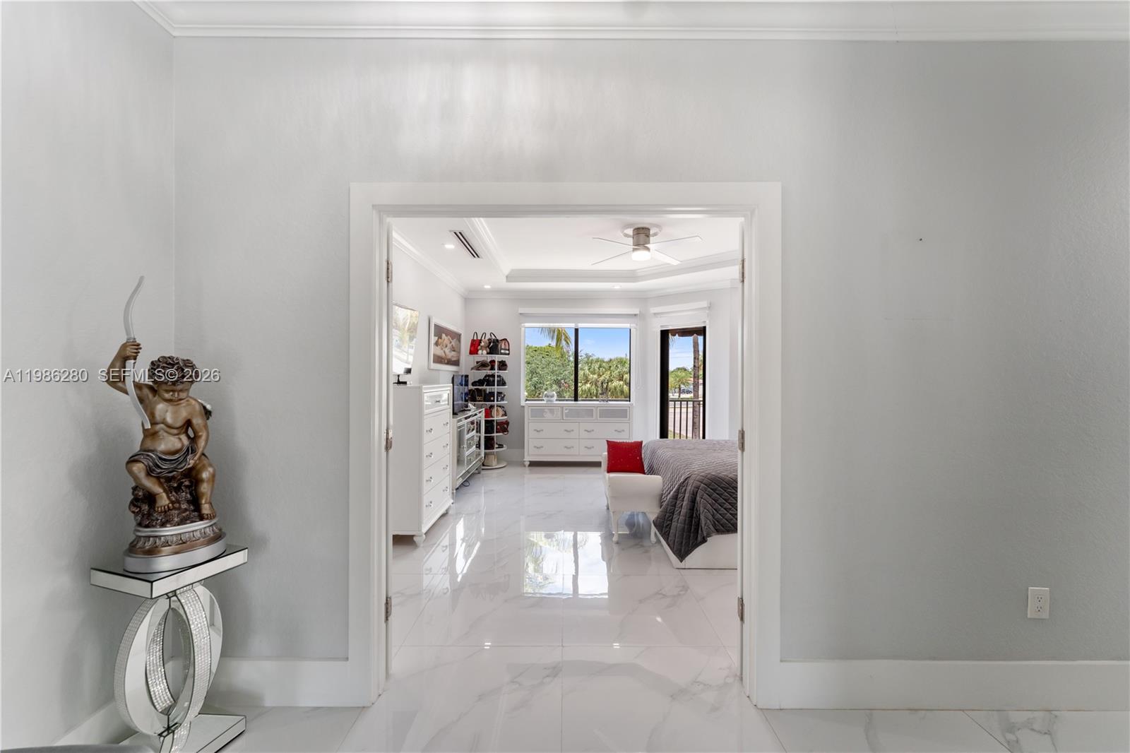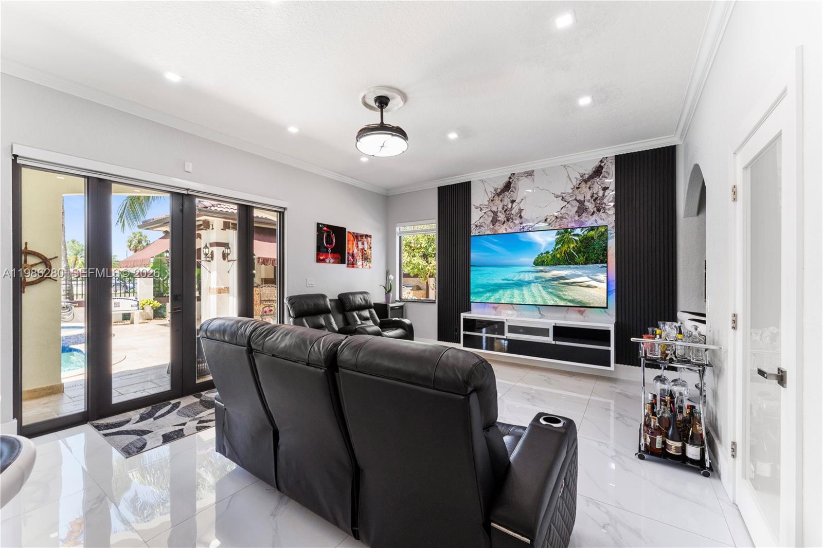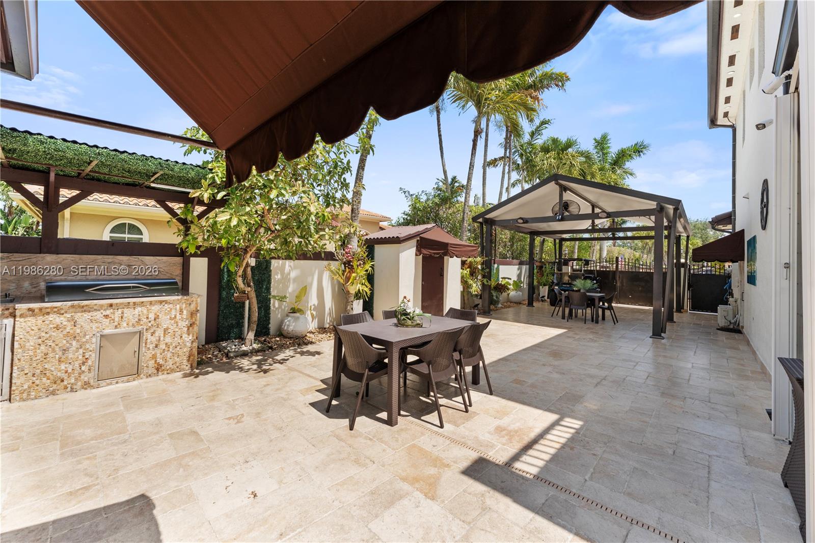 Welcome to 7777 NW 169th Terrace, a true gem located in the highly sought-after gated community of Royal Oaks in Miami Lakes. This impressive two-story single-family residence is one of the first fully fenced homes in the neighborhood, boasting a grandfathered electric triple driveway gates - a rare and valuable safety feature. Meticulously remodeled from floor to ceiling and front to back, this 5-bedroom, 3 1/2 bathroom home is move in ready and designed to impress. Enjoy serene canal views, a lushly landscaped front yard, and entertainer's dream backyard. Step outside to your private resort-style retreat featuring a saltwater heated swimming pool with spa, brand new pool pump, elegant pergolas and a fully loaded concrete gazebo complete with gas range, refrigerator, granite countertops, and custom cabinetry. Entertain effortlessly with a second outdoor grill station, pig roaster, outdoor sinks, surround sound system, two storage sheds and a fully remodeled pool bathroom with walk in shower. The entire driveway, side yard and backyard are mud-set travertine for maximum convenience and aesthetics. Inside, discover refined modern living with 24x24 designer tiles, zebra blinds, impact glass panel staircase, and custom closet cabinetry in every bedroom. The kitchen is a chef's dream, outfitted with high-end imported Italian acrylic cabinetry and stone, a striking waterfall island, Smart Samsung refrigerator and premium Samsung appliances.