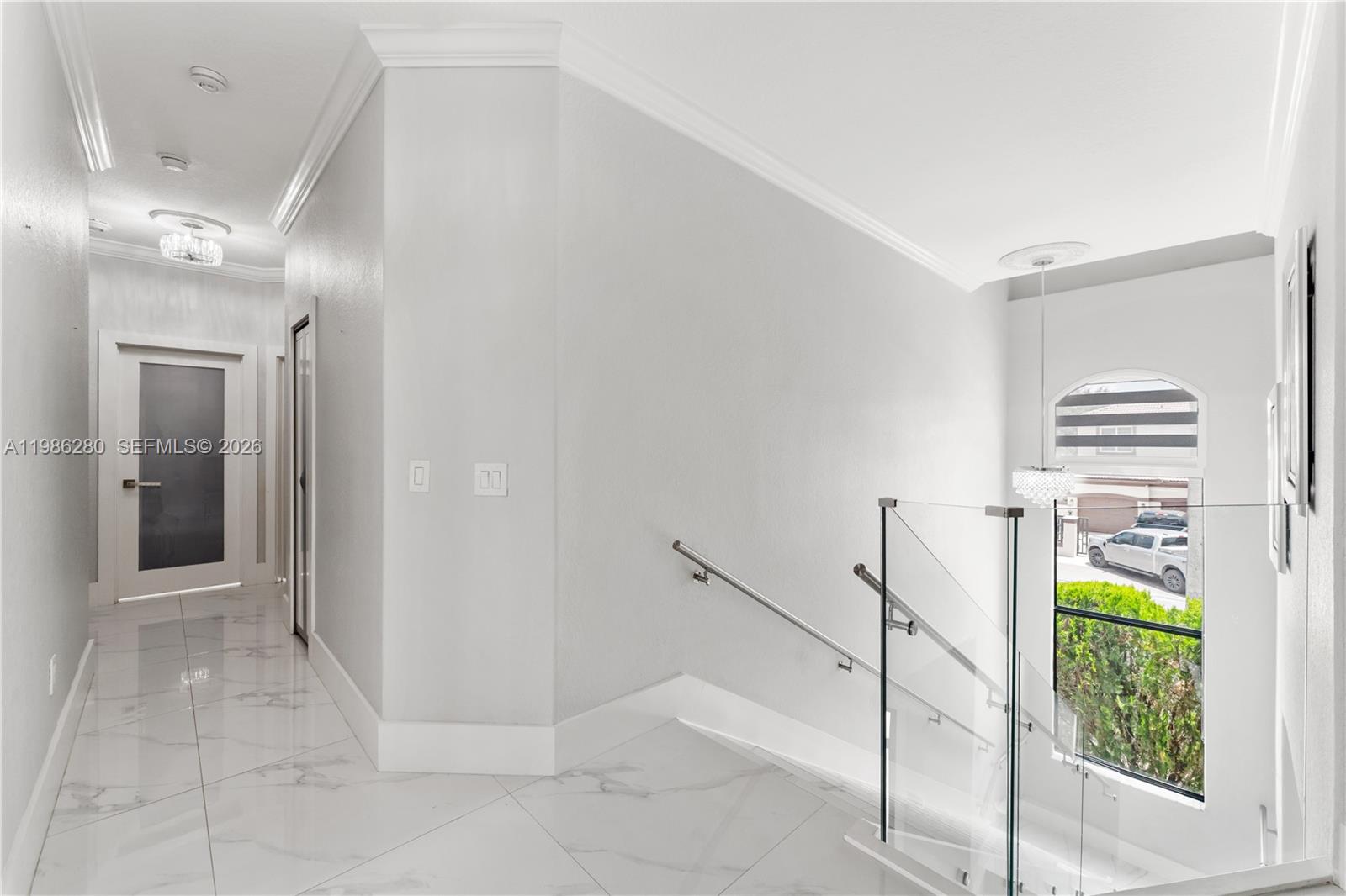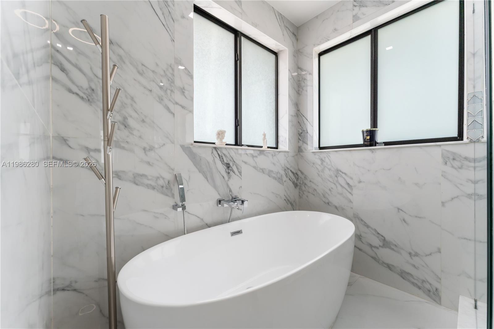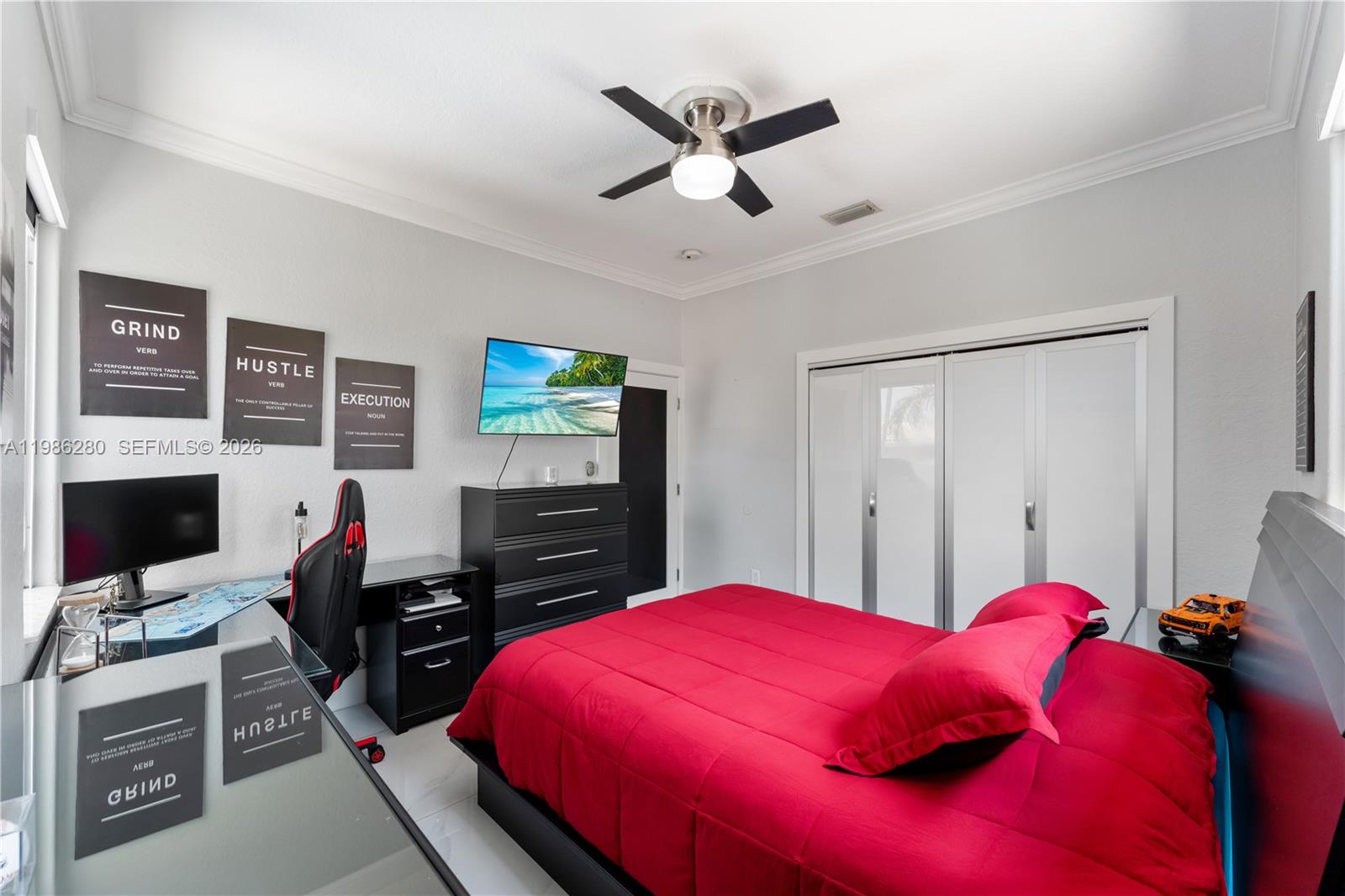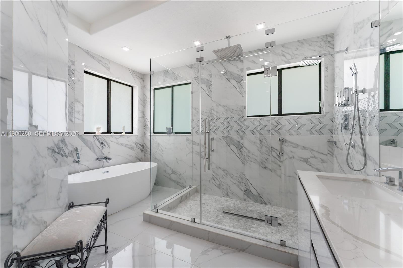 Welcome to 7777 NW 169th Terrace, a true gem located in the highly sought-after gated community of Royal Oaks in Miami Lakes. This impressive two-story single-family residence is one of the first fully fenced homes in the neighborhood, boasting a grandfathered electric triple driveway gates - a rare and valuable safety feature. Meticulously remodeled from floor to ceiling and front to back, this 5-bedroom, 3 1/2 bathroom home is move in ready and designed to impress. Enjoy serene canal views, a lushly landscaped front yard, and entertainer's dream backyard. Step outside to your private resort-style retreat featuring a saltwater heated swimming pool with spa, brand new pool pump, elegant pergolas and a fully loaded concrete gazebo complete with gas range, refrigerator, granite countertops, and custom cabinetry. Entertain effortlessly with a second outdoor grill station, pig roaster, outdoor sinks, surround sound system, two storage sheds and a fully remodeled pool bathroom with walk in shower. The entire driveway, side yard and backyard are mud-set travertine for maximum convenience and aesthetics. Inside, discover refined modern living with 24x24 designer tiles, zebra blinds, impact glass panel staircase, and custom closet cabinetry in every bedroom. The kitchen is a chef's dream, outfitted with high-end imported Italian acrylic cabinetry and stone, a striking waterfall island, Smart Samsung refrigerator and premium Samsung appliances.