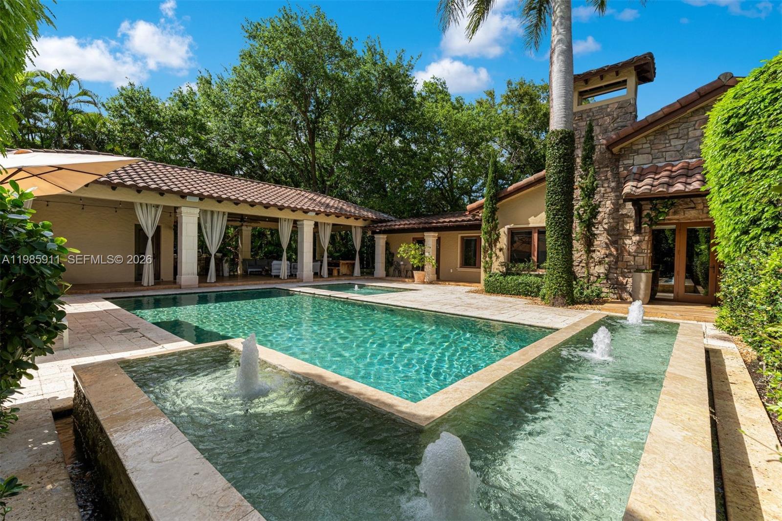 Set on a sprawling 1.12-acre lot in the heart of Pinecrest, this extraordinary grand Tuscan-inspired estate offers 6,624 SF under air and 9,771 total SF with 6 bedrooms and 8.5 bathrooms. A gated entry and sweeping oak-lined driveway lead to a private, resort-style compound defined by timeless Mediterranean architecture, a barrel tile roof, and lush, manicured grounds. The multi-structure layout surrounds a spectacular heated saltwater pool and spa, with covered terraces and a fully equipped summer kitchen for seamless indoor-outdoor living. Interiors feature soaring ceilings, travertine, wood and stone floors, a dramatic atrium courtyard, formal living and dining rooms, and a spacious family room. The chef’s kitchen is equipped with granite countertops, custom cabinetry, Sub-Zero refrigeration, and a full Thermador appliance suite. Additional highlights include a custom bar, wine cellar, home theater, and private office. The main-level primary suite offers a sitting area and a spa-inspired bath with soaking tub, dual vanities, and walk-in closets. A separate guest residence with living area and kitchenette, plus staff quarters, provide flexibility. Modern comforts include impact windows, Control4 smart home and audio, Generac generator, mosquito system, 3-car garage, and more—delivering exceptional privacy and comfort in one of Pinecrest’s most desirable settings.