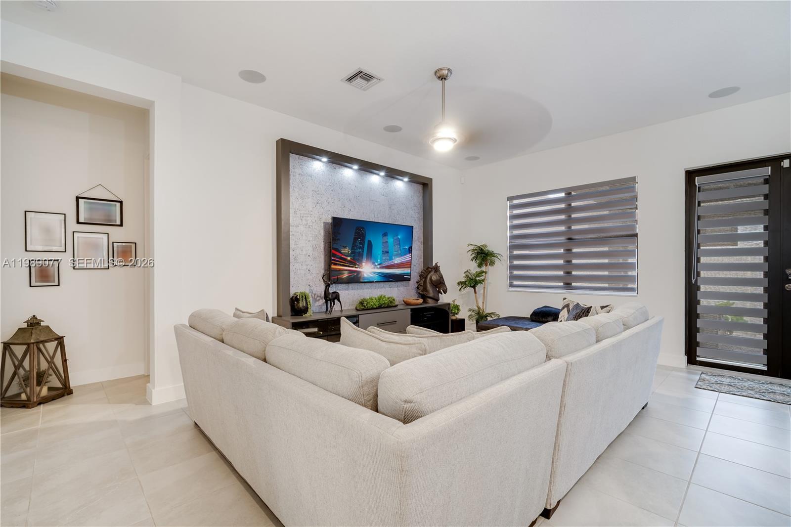 Experience modern luxury in this stunning 4-bedroom, 3-bathroom single-story residence, where high ceilings and designer window treatments create an airy, sophisticated ambiance. The open-concept living space is anchored by a striking decorative wall and a family room featuring a custom built-in entertainment unit and ceiling-mounted surround sound. The chef-inspired kitchen boasts an upgraded oversized island and a walk-in pantry with ample storage. Retreat to the primary suite to find a meticulously crafted custom closet. Outdoor living is redefined in the private backyard, fully enclosed by a PVC fence with dual side gates and featuring extensive premium pavers wrapping the home and extending to an oversized driveway. Entertain under the custom pergola, equipped with integrated lighting and a cooling fan. Modern essentials include a security camera system with a dedicated monitor and overhead garage storage racks. Residents enjoy resort-style amenities including a clubhouse, fitness center, pool, and playground. With its prime location near Memorial Hospital and easy access to I-75 and the FL Turnpike, this home offers the perfect balance of luxury and convenience. This turn-key property is ready for its most discerning buyers.