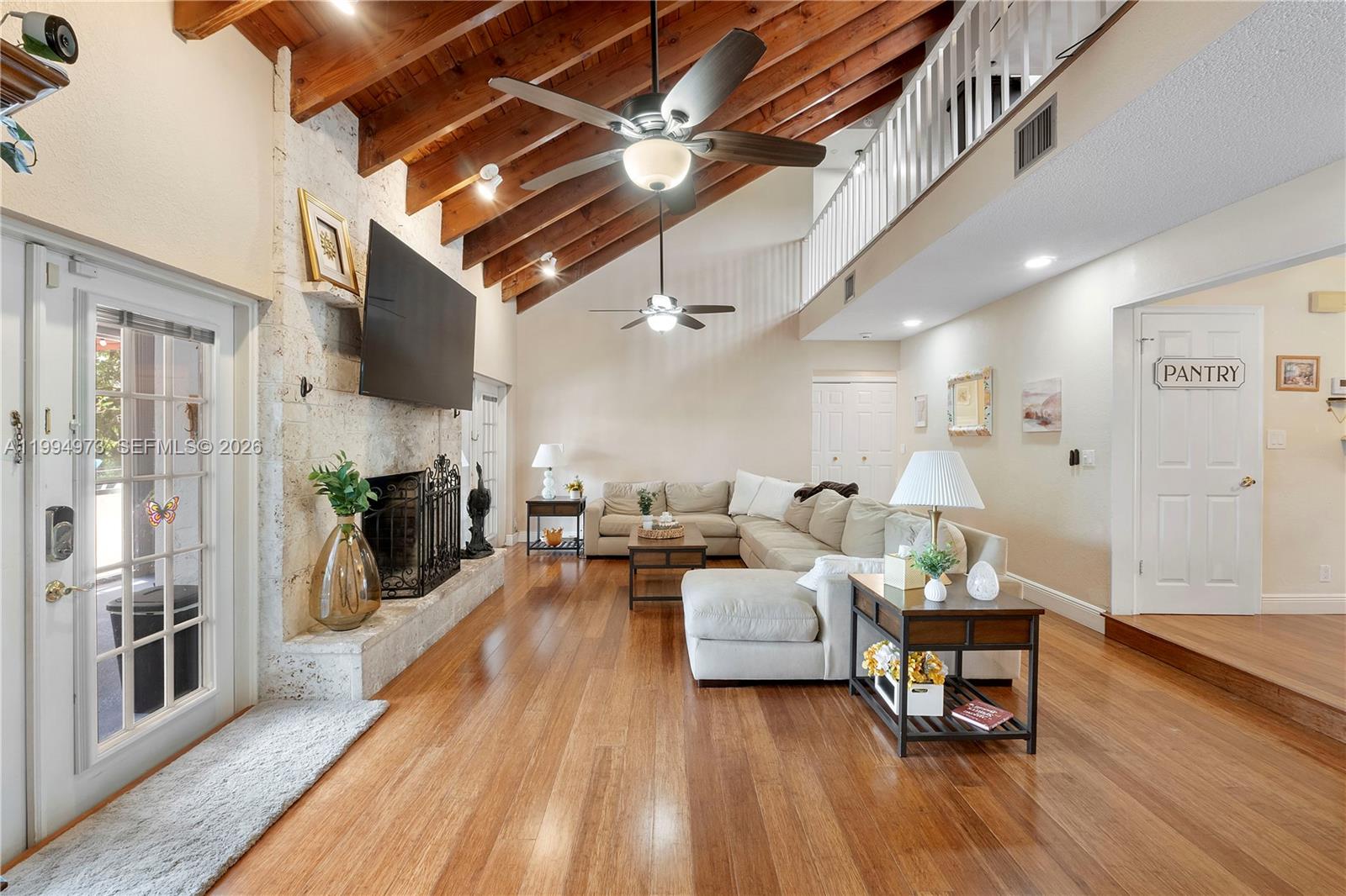 Beautifully updated 6-bedroom, 3.5-bath pool home with tranquil lake views in a highly sought-after neighborhood, offering more than 3,800 sq ft under air. This spacious layout features two living areas, providing plenty of room for entertaining and everyday living. The main living room is a standout with a cozy fireplace and stunning wood ceilings with exposed beams that extend into the loft area, adding warmth and character throughout. The kitchen has a warm, rustic feel, featuring granite countertops and stainless steel appliances, blending charm with functionality. The home offers two primary suites, one on the first floor and another upstairs, ideal for multi-generational living or added flexibility. Bamboo wood and tile flooring run throughout for a clean, low-maintenance finish. Step outside to your private pool overlooking the lake, creating the perfect setting for relaxing or entertaining. A rare combination of space, style, and location.