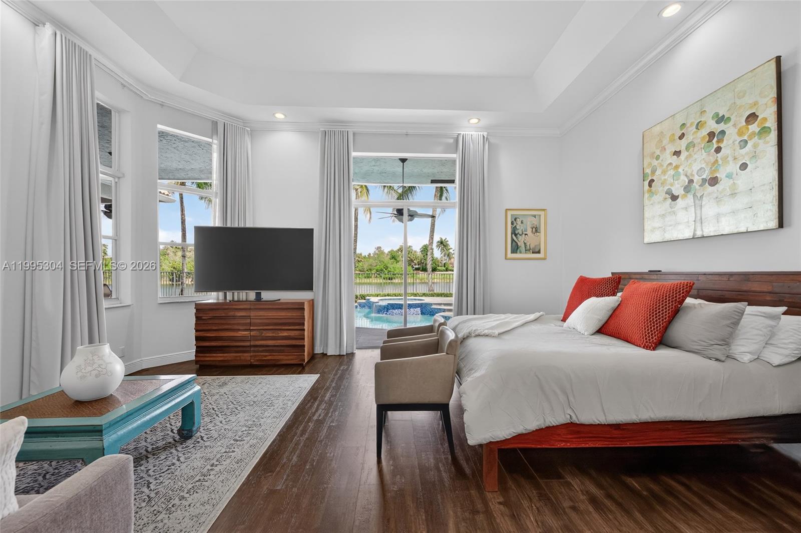 Beautiful one-story home located in the desirable north section of Victoria Isle within Weston Hills, known for its oversized lots and enhanced privacy. Situated on a 16,000 sq ft lot with serene lake views, this residence offers 5 bedrooms and 3.5 bathrooms and just under 4,000 sq ft of living space, with tile flooring throughout the main living areas and updated wood floors in the bedrooms. High ceilings create a bright and open feel. The modern white kitchen features granite countertops, stainless steel appliances, and a functional layout open to the living areas. Bathrooms are well maintained and tastefully appointed. The primary suite includes a sitting area, two walk-in closets, and an oversized bathroom featuring dual sinks, an oversized shower, and Jacuzzi. The home features curtains and blackout shades in all bedrooms, along with wood plantation shutters in the formal dining room and office. Motorize blinds in family room area. Enjoy outdoor living with a private pool, lake views, a beautifully landscaped yard, and a circular driveway. The entire backyard is finished with gray marble, offering a sleek, low-maintenance space. Additional features include a 3-car garage, 2 A/C units (2023-2024) equipped with a Nest system. Recently smoothed walls and ceilings throughout, and freshly painted interior and exterior. ROOF TO BE REPLACED SOON (2026). A true gem in the prestigious Country Club of Weston.
