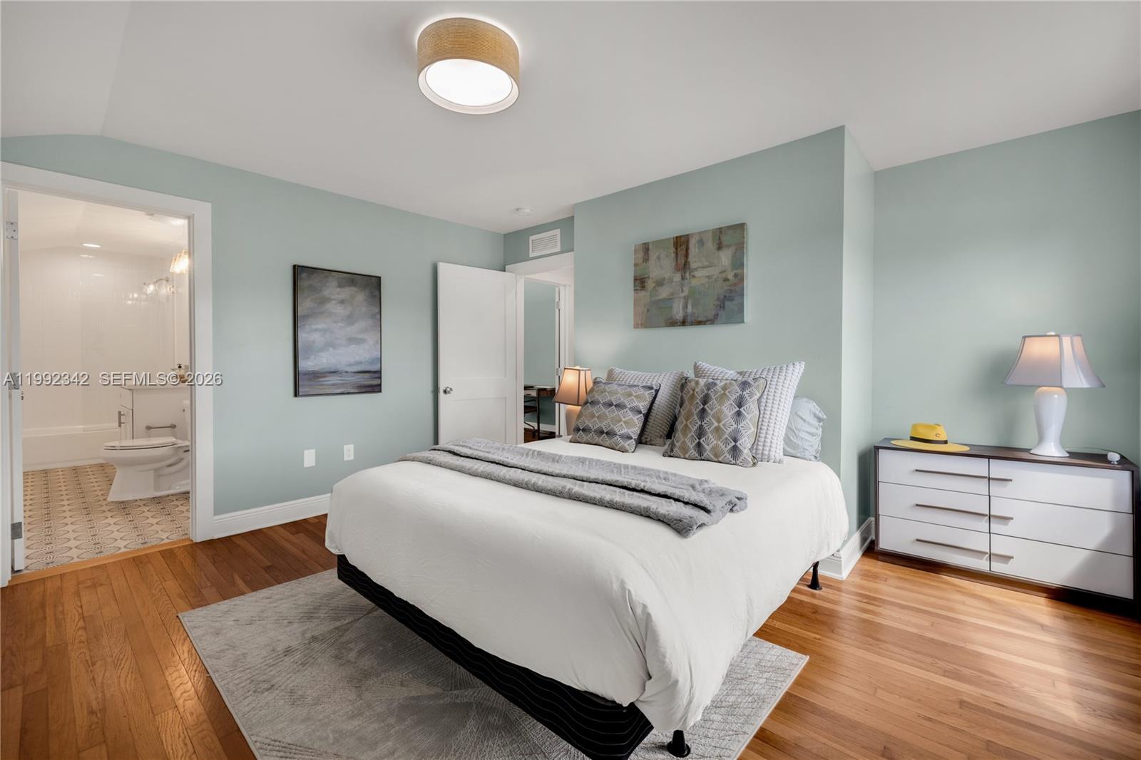 This one is special! Introducing Le Château, a fully reimagined 1925 estate in the lush enclave of El Portal—where historic architecture meets curated modern living. This rare offering includes a 4-bedroom, 3-bath main residence plus a detached 1-bedroom, 1-bath guest house, totaling 5 bedrooms and 4 baths across 3,300+ SF. A gracious front porch opens to grand interiors with soaring 10-foot ceilings, layered plasterwork, sculptural coffered details, and museum-quality crown moldings. Restored hardwood floors run throughout, anchored by a marble fireplace, with custom built-ins and a formal dining room creating an elegant yet inviting setting. The redesigned kitchen blends clean modern finishes with functionality while honoring the home’s architectural soul. The main level features a spa-like primary ensuite and an additional guest bedroom with full bath. Upstairs offers two bedrooms, a shared bath, and a charming loft retreat. Thoughtfully upgraded with impact windows and doors, metal roof, electrical, plumbing, and HVAC—this is a true turnkey residence. Outdoors, marble-clad patios and manicured grounds create a private setting with room for a pool. The detached guest house offers flexibility for guests, office, or income. Set beneath a majestic oak canopy in a non-flood zone on one of El Portal’s most picturesque streets—there is truly nothing else like it.