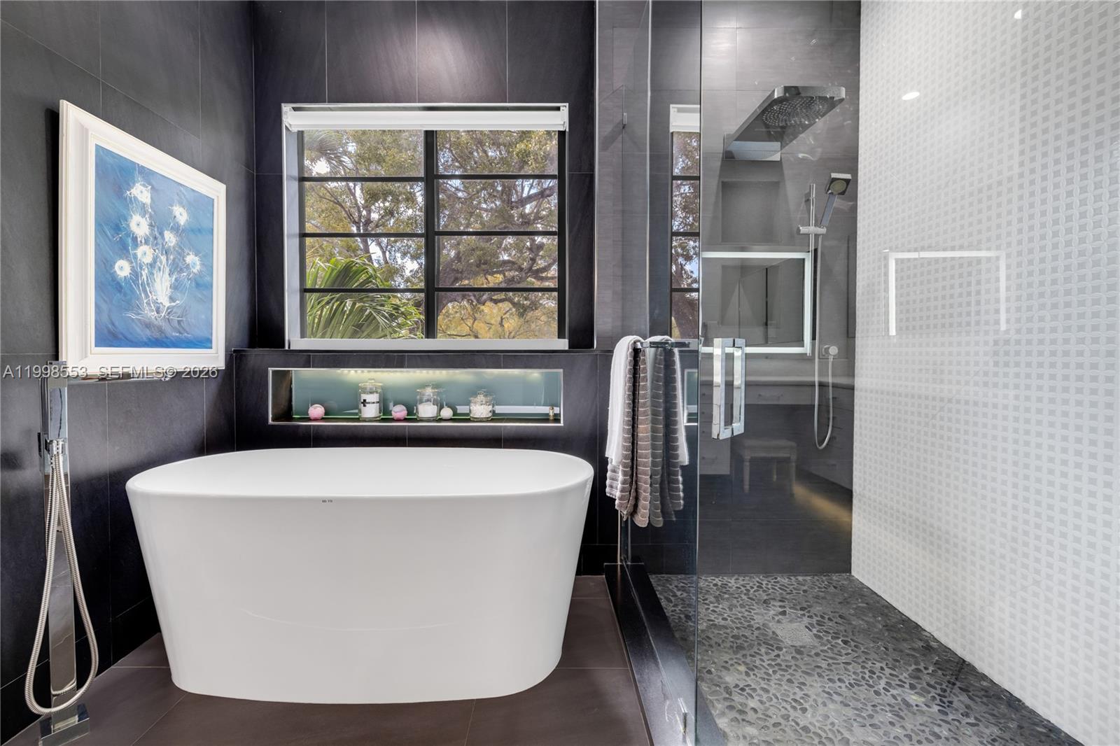Step into a gated modern estate that delivers the ultimate blend of privacy, design, and resort-style living in one of Miami Shores’ most sought-after locations east of Biscayne. From the moment you enter, soaring ceilings, a dramatic floating marble fireplace, and a wide open layout create an immediate sense of scale and impact, all seamlessly connected to the outdoor living spaces and pool. The chef’s kitchen is designed to impress and perform, featuring custom teak cabinetry, marble countertops, and a refined breakfast banquette that anchors the space. The primary suite offers a true retreat with grand volume, a private terrace, and a spa-inspired bath that rivals luxury hotels. The outdoor experience is where this home truly stands apart. A 50 ft pool, sauna, expansive lounge areas, and a fully equipped summer kitchen set the stage for unforgettable entertaining. Elevated above it all, a covered lounge with a full wet bar, accessible from both the exterior and second level, delivers a one of a kind vantage point and experience rarely available. A detached 1 bedroom, 1 bathroom guest house, spacious two car garage, gated side parking, electric vehicle charging, and a Control4 smart home system complete the offering. With rare duplex zoning and a prime east of Biscayne location, this is a unique opportunity that demands to be seen in person.Residense offers gated side parking + AC garage with electric charging station + Control 4 Smart system for the entire home.