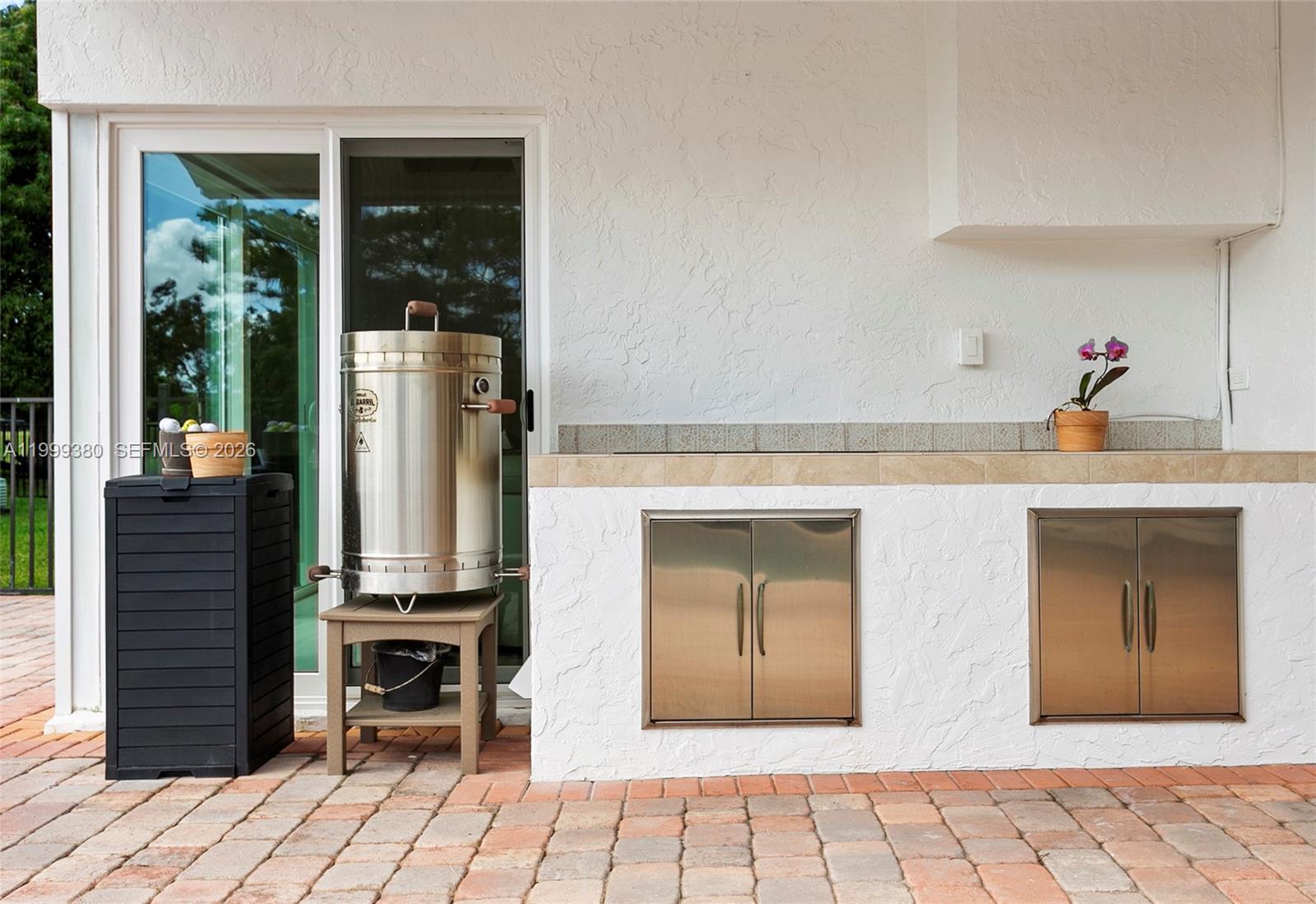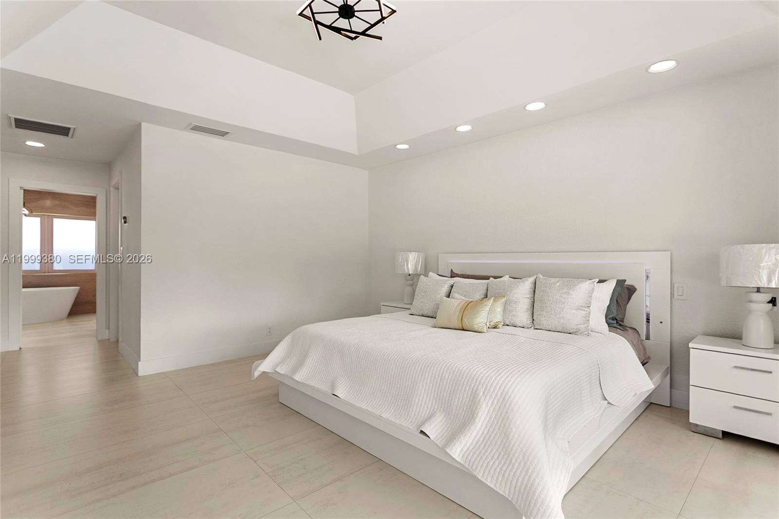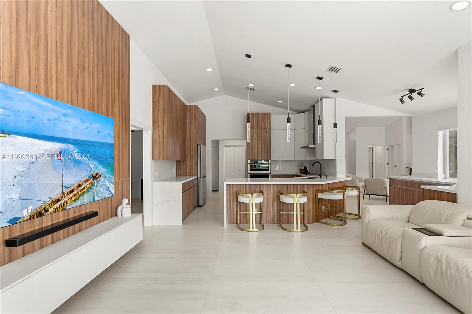 Step into luxury with this stunning, fully upgraded waterfront residence, where modern design meets cutting-edge smart living. Turnkey home, freshly painted inside and out, offering elegance, comfort, and innovation—enhanced by beautifully updated landscaping, a two-car garage, and breathtaking water and golf course views in the rear. Rectified Italian porcelain tile flooring throughout, completely renovated home. State-of-the-art chef’s kitchen, with custom cabinetry, striking quartz waterfall countertops, and brand-new 2024 appliances. Beautiful chimney. Impact windows throughout, a 2023 foam-insulated attic, a 2023 water heater, and a high-performance HVAC system. Fully equipped smart lighting system, smart sprinkler control panel, smart pool controls, and a unified security system for ultimate convenience and security. Primary suite features a large bedroom, custom walk-in closets, beautifully remodeled, modern-designed bathrooms with high-end finishes. Spacious second bedroom with walk-in closets. Additional upgrades include new interior doors, renovated laundry room with cabinetry, designer lighting fixtures and window treatments. Wine enthusiasts will love the climate-controlled, state-of-the-art wine cellar. Outdoor living with a pool, new outdoor cooktop, and water and golf course views. This residence offers the ultimate in luxury, technology, and lifestyle. A rare waterfront and golf course view opportunity—schedule your private showing today.