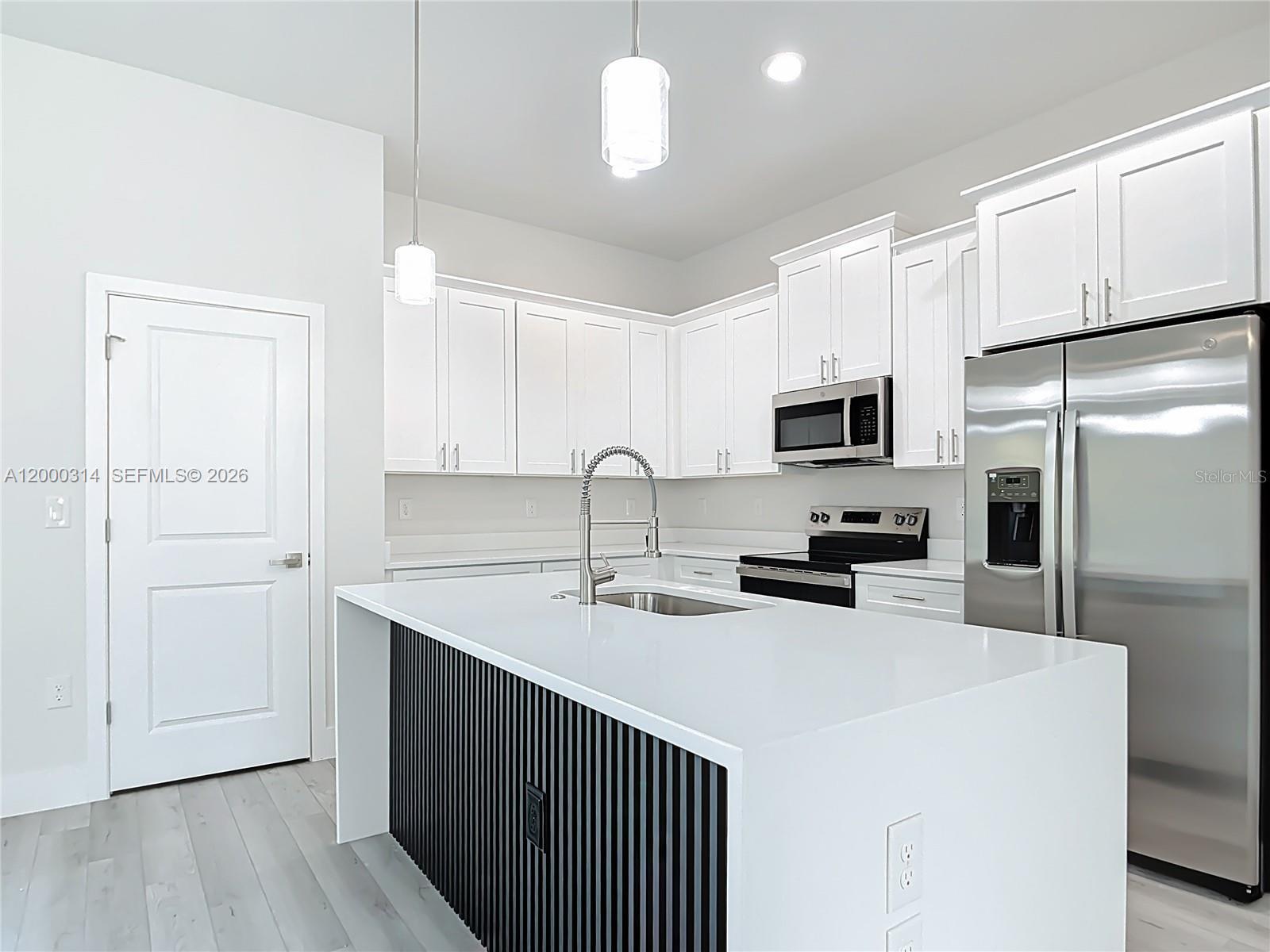 SELLER IS MOTIVATED AND WILL CONTRIBUTE TOWARD THE BUYER’S CLOSING COSTS. WELCOME TO THIS BEAUTIFULLY DESIGNED MODERN HOME. This 4-bedroom, 2.5-bath residence offers 1,695 sq. ft. of well-planned living space with an open-concept layout and contemporary finishes throughout. The kitchen features a striking quartz waterfall island and clean, modern cabinetry, ideal for both everyday living and entertaining. The living area is highlighted by an electric fireplace, adding warmth and character to the space. THE PRIMARY SUITE SERVES AS A PRIVATE RETREAT, complete with a spa-inspired bathroom featuring a freestanding tub, dual sinks, and elegant marble-style tile. Covered lanai, A SPACIOUS 3-CAR GARAGE offers approximately 721 sq. ft., ideal for vehicles, storage, or a workshop. With a total construction area of 2,625 sq. ft., this home blends comfort, functionality, and modern design. Additional features include a smart key system for added security and a 2-10 Home Buyers Warranty.