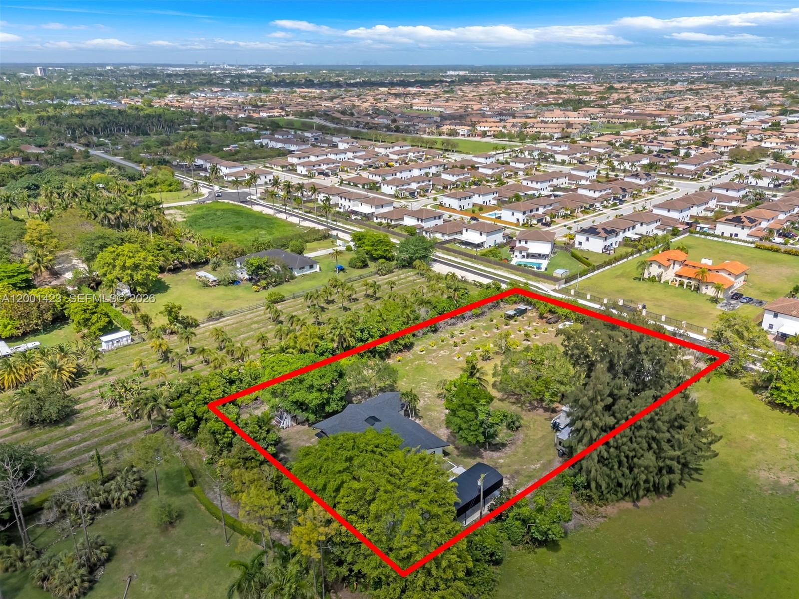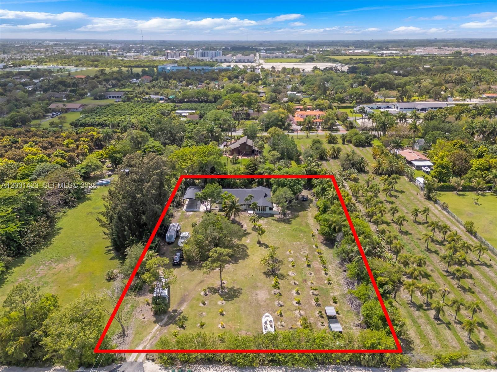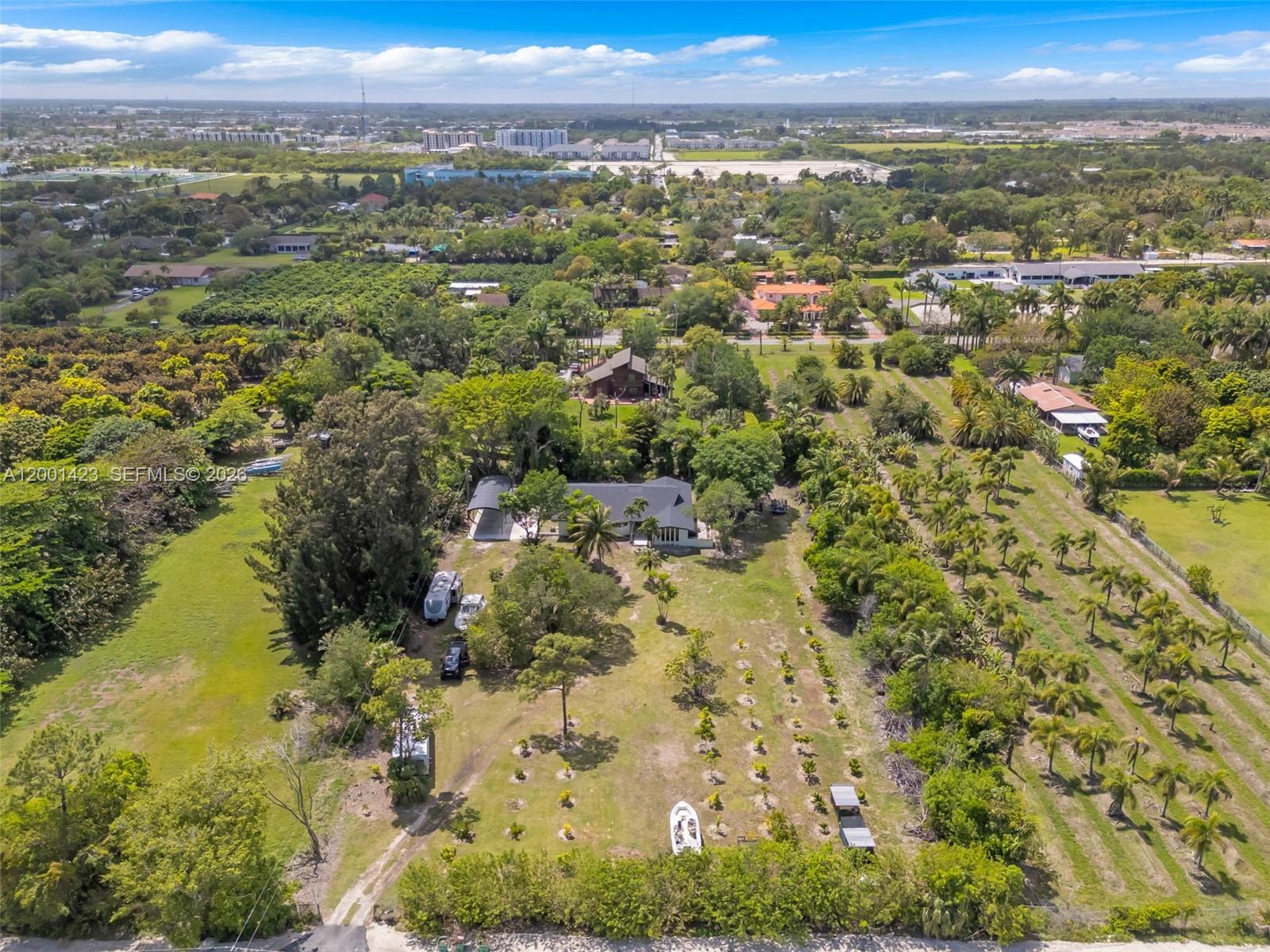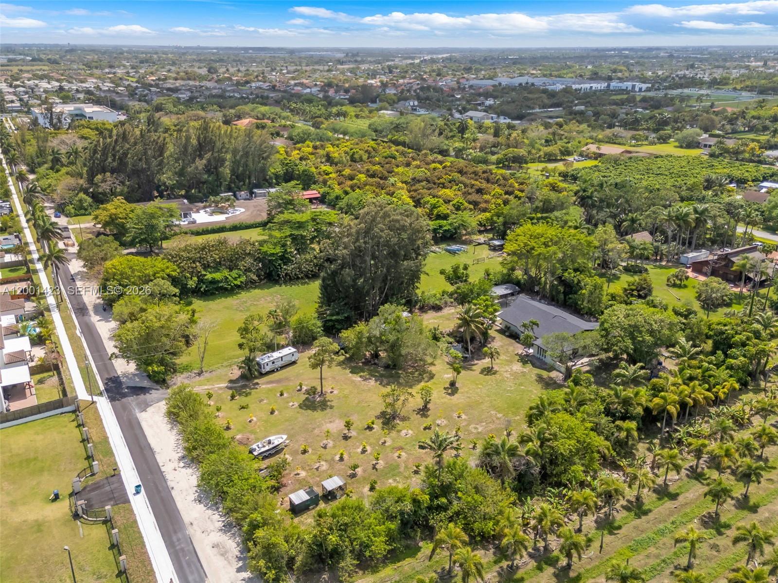 This beautifully remodeled 4 bedroom, 2 bathroom residence offers a rare blend of architectural character, modern upgrades, and expansive outdoor living. From the moment you arrive, the property sets a distingueshed tone with its clean, modern lines. Inside, a bright open layout is enhanced by elegant Italian tile flooring and incredible natural light. The main living area features soaring vaulted wood ceilings and dramatic floor to ceiling windows, creating a warm yet sophisticated space ideal for both everyday living and entertaining. At the heart of the home, a stunning glass enclosed interior garden courtyard creates a true architectural statement, bringing natural elements indoors and serving as a tranquil focal point that seamlessly connects multiple living spaces. The chef’s kitchen showcases sleek cabinetry, stainless steel appliances, and quartz countertops with a waterfall edge island. Completely renovated in 2024, no expense spared in this meticulous renovation, showcasing top of the line materials, the home includes new plumbing, electrical, roof, A/C, & so much more, along with commercial grade impact windows and doors. The property offers over 50 fruit trees, expansive grounds with room to create your own ideal outdoor setting, like a pool or outdoor kitchen, the possibilities are unless. A covered boat/RV shelter with electricity. Ideally located just minutes from the Florida Turnpike, shopping and dining options, less than 5 miles from Black Point Marina, offering direct access to Biscayne Bay for boating and waterfront dining.