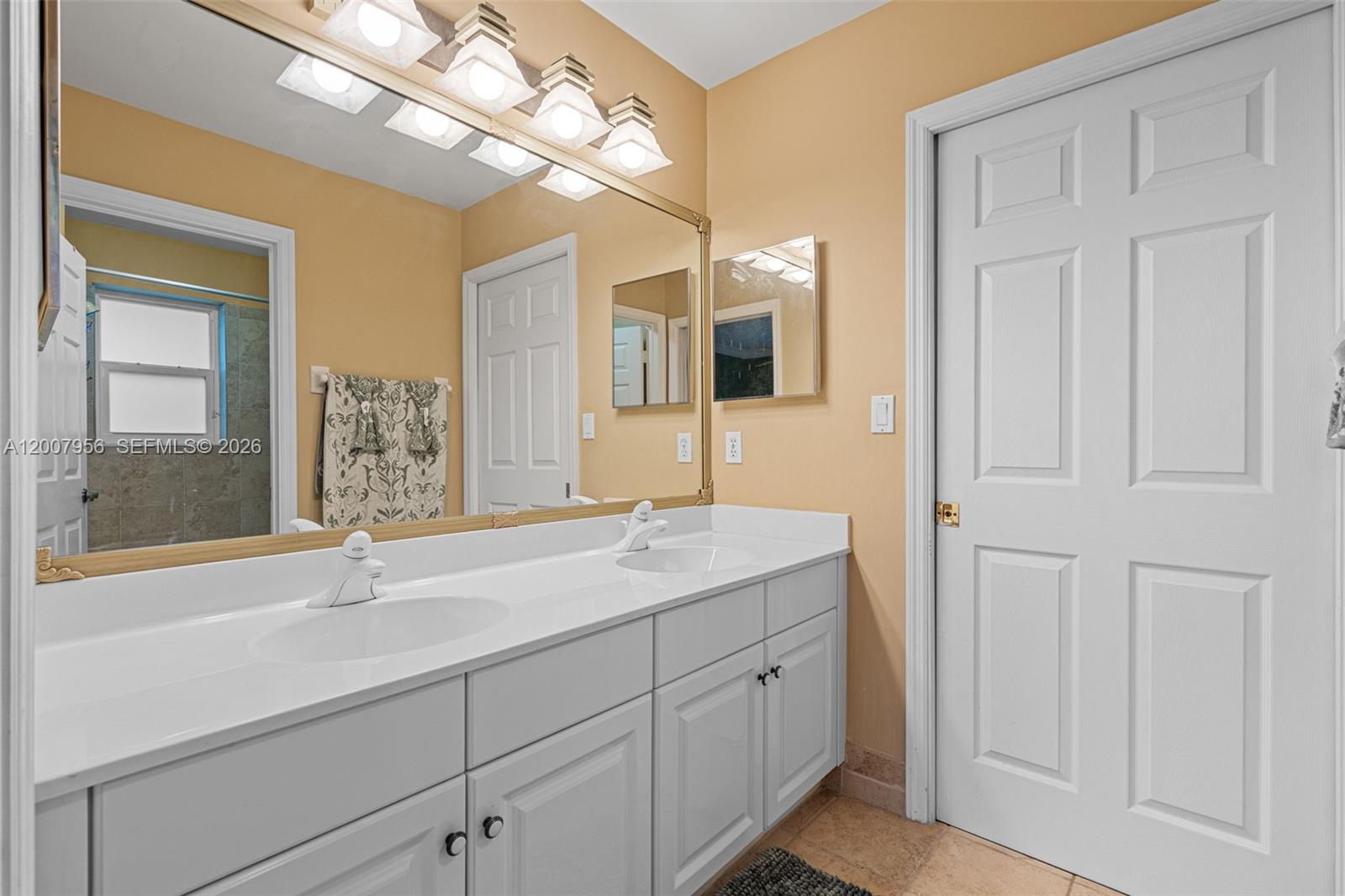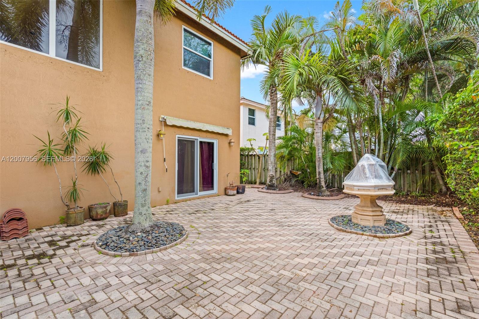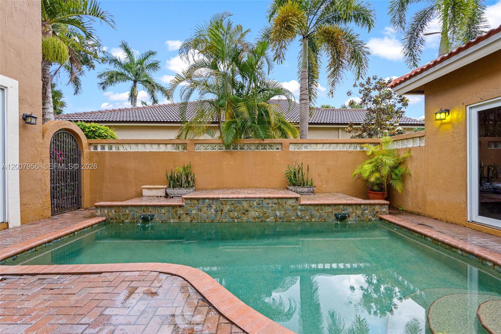 Stunning courtyard pool home in the gated community of Emerald Estates, featuring 4 bedrooms, 4 bathrooms, and a desirable private guest house. Designed for both comfort and entertaining, the guest house overlooks the pool, creating a unique and inviting indoor-outdoor living experience. The home showcases quality upgrades throughout, including impact windows, laminate flooring, custom paint, crown molding, and architectural niches. The renovated kitchen features shaker-style cabinetry, granite countertops, stainless steel appliances, and a custom hood. Bathrooms have been thoughtfully updated with modern finishes. The impressive living room boasts a dramatic 20-foot ceiling and elegant iron staircase. Upstairs, a loft connects two bedrooms with a Jack-and-Jill bath. The spacious primary suite offers a sitting area, custom walk-in closet, and a spa-like bathroom with soaking tub, separate shower, and dual vanities. Enjoy outdoor living with lush tropical landscaping, landscape lighting, a pergola, paver patio and walkways, heated pool, spa, and a fully fenced yard.