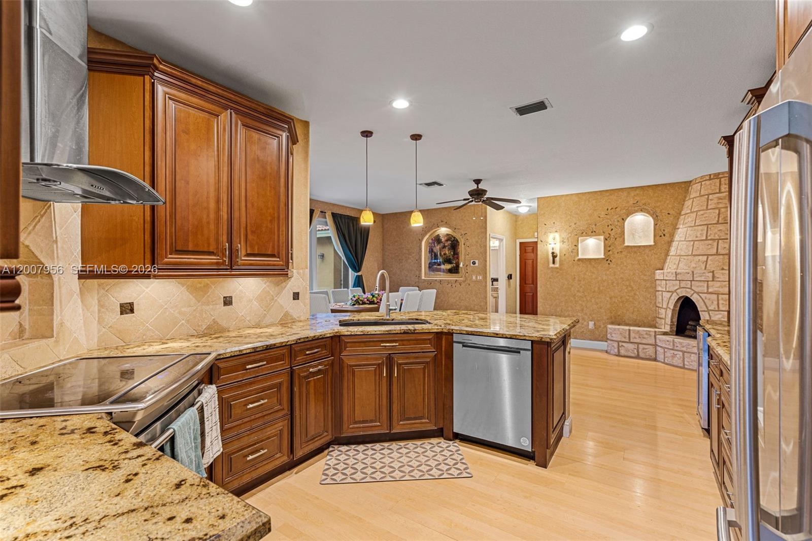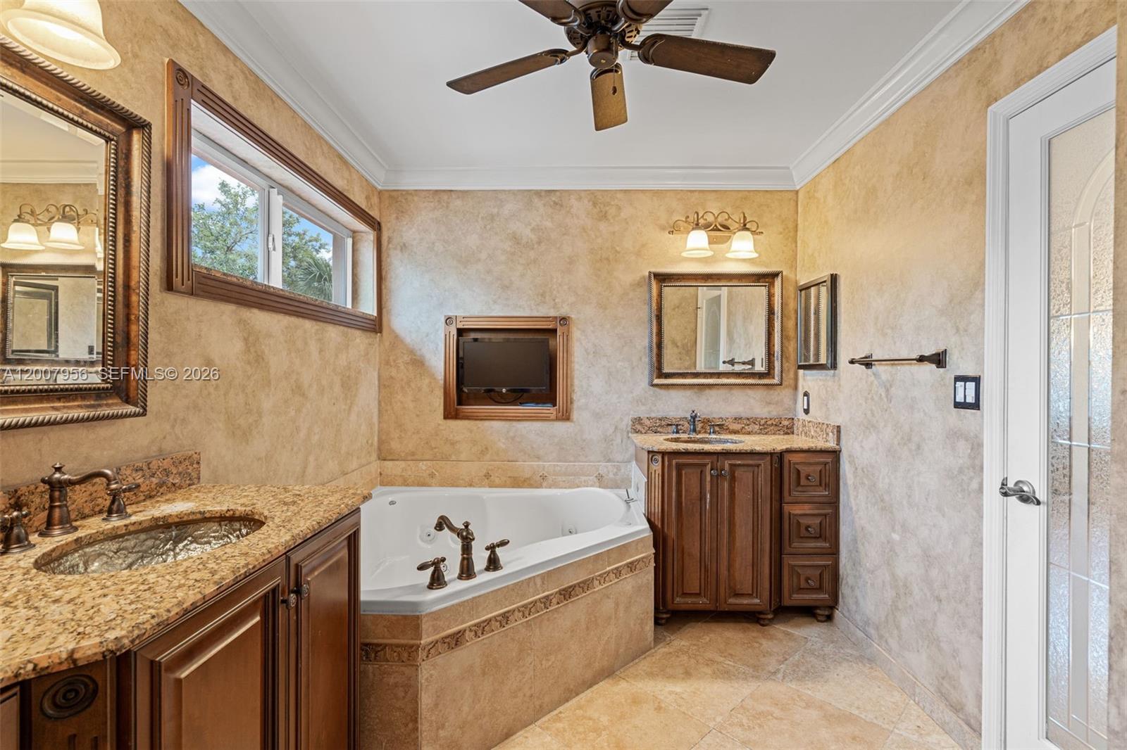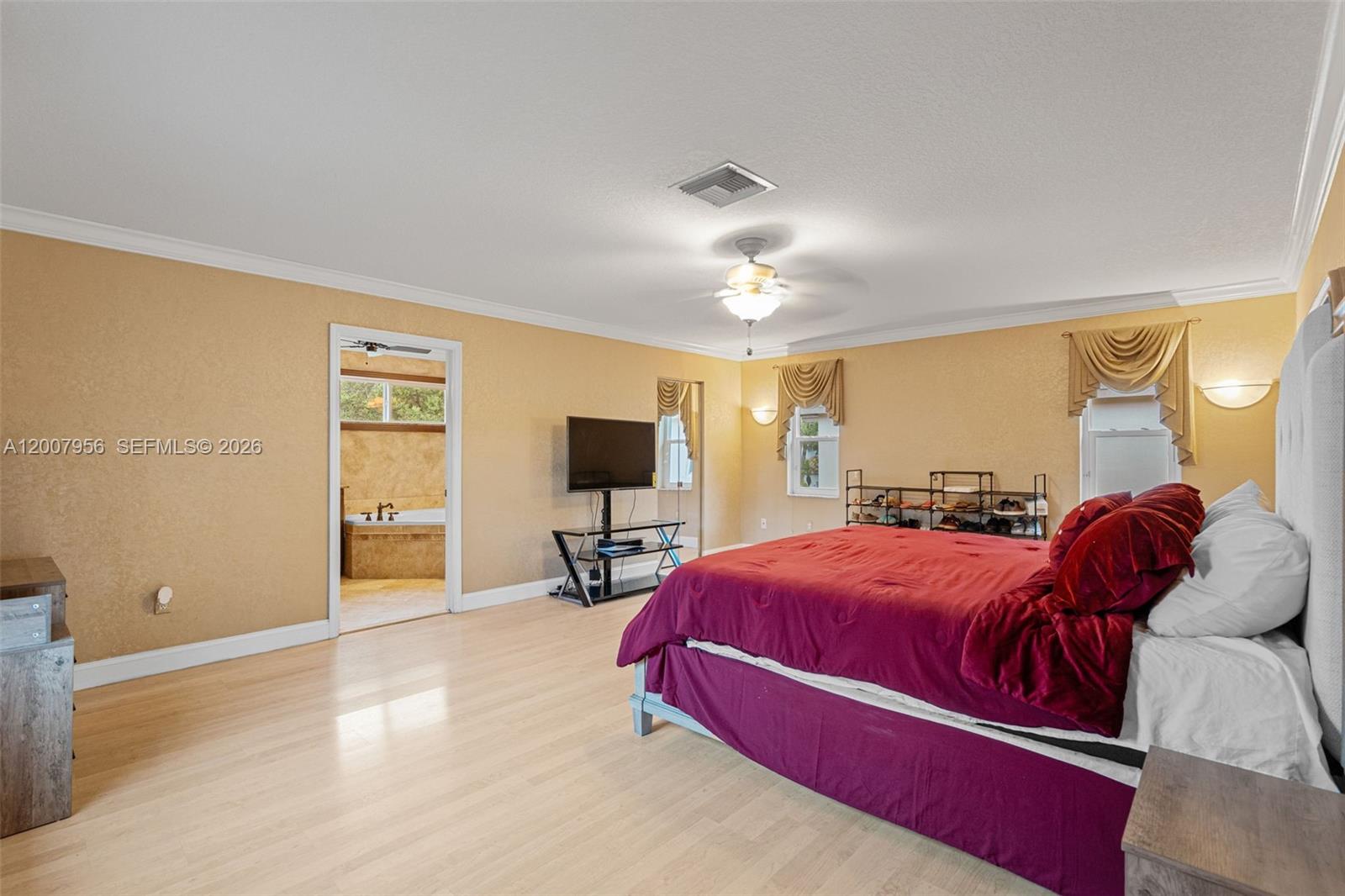 Stunning courtyard pool home in the gated community of Emerald Estates, featuring 4 bedrooms, 4 bathrooms, and a desirable private guest house. Designed for both comfort and entertaining, the guest house overlooks the pool, creating a unique and inviting indoor-outdoor living experience. The home showcases quality upgrades throughout, including impact windows, laminate flooring, custom paint, crown molding, and architectural niches. The renovated kitchen features shaker-style cabinetry, granite countertops, stainless steel appliances, and a custom hood. Bathrooms have been thoughtfully updated with modern finishes. The impressive living room boasts a dramatic 20-foot ceiling and elegant iron staircase. Upstairs, a loft connects two bedrooms with a Jack-and-Jill bath. The spacious primary suite offers a sitting area, custom walk-in closet, and a spa-like bathroom with soaking tub, separate shower, and dual vanities. Enjoy outdoor living with lush tropical landscaping, landscape lighting, a pergola, paver patio and walkways, heated pool, spa, and a fully fenced yard.