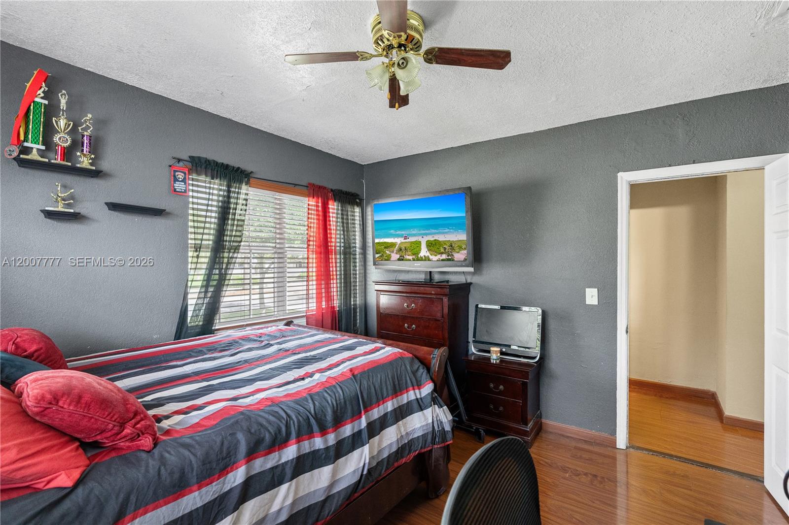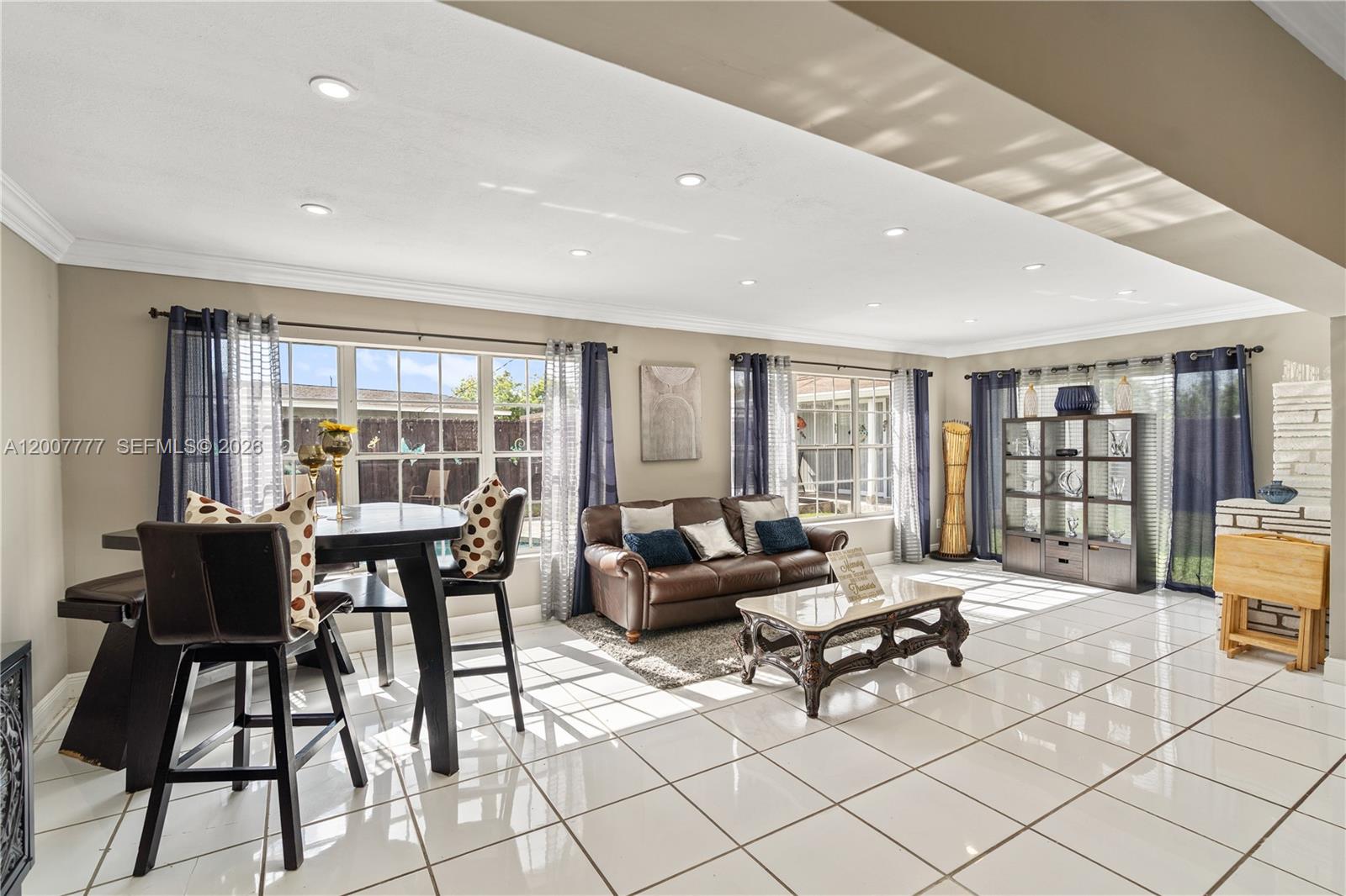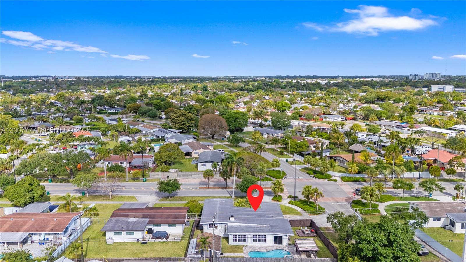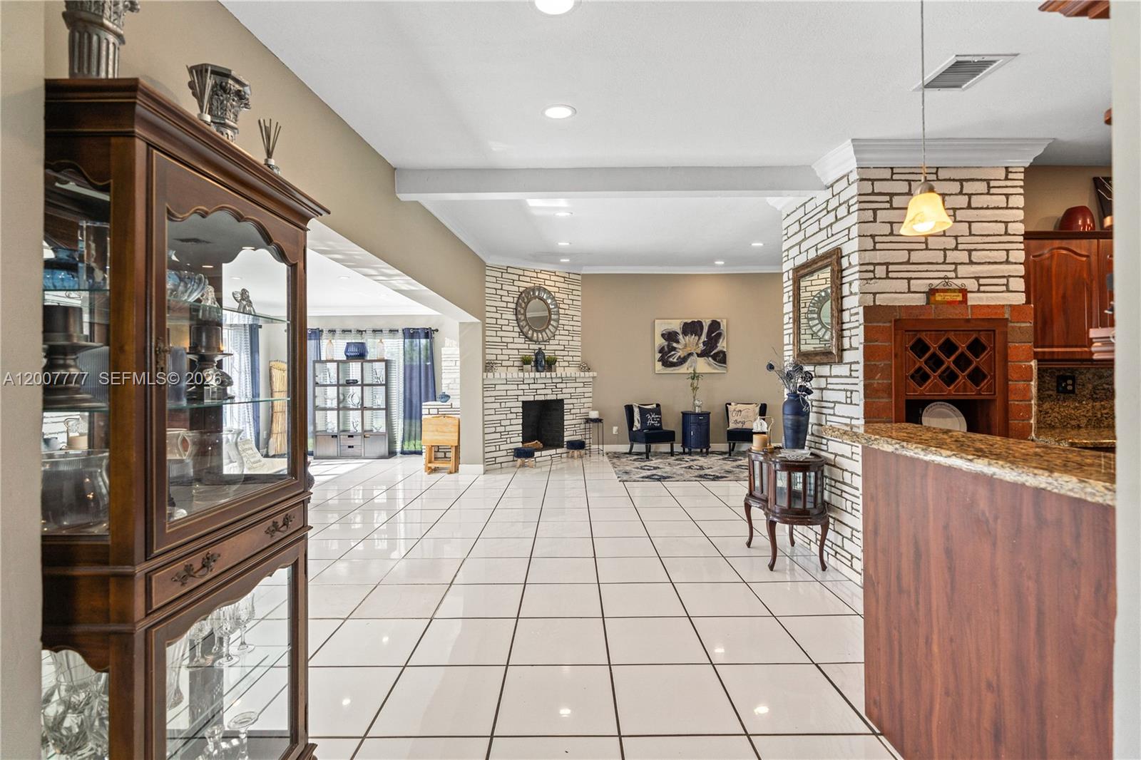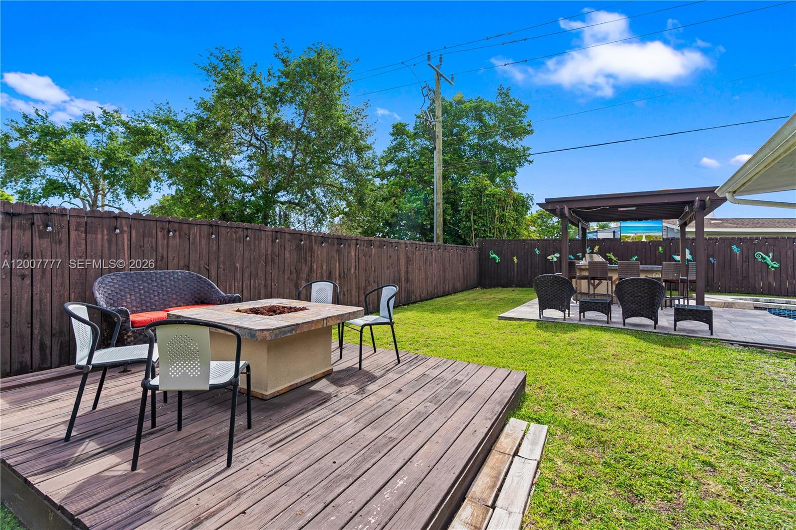 Exceptional corner lot residence featuring a thoughtfully designed layout and an outstanding outdoor living environment. The backyard serves as the focal point, showcasing a custom-shaped swimming pool with integrated spa, resurfaced in 2019, complemented by a natural stone deck, covered pergola, and a fully equipped outdoor kitchen with bar seating. Additional highlights include a detached structure suitable for storage or potential cabana use, as well as a separate wood deck with fire pit. Interior spaces include a spacious open living room with a white brick fireplace, seamlessly connecting to a sunlit Florida room offering expansive pool views. The kitchen is appointed with granite countertops and stainless steel appliances, while the adjacent family room provides a comfortable secondary living area. Bedrooms are positioned on a split level and feature wood flooring. A converted garage offers excellent versatility with a private entrance, full bathroom, and mini-split A/C, making it suitable for in-law quarters, office space, or income-producing use. Additional features include full accordion shutters, a fenced yard, and multiple parking options including side driveway access.