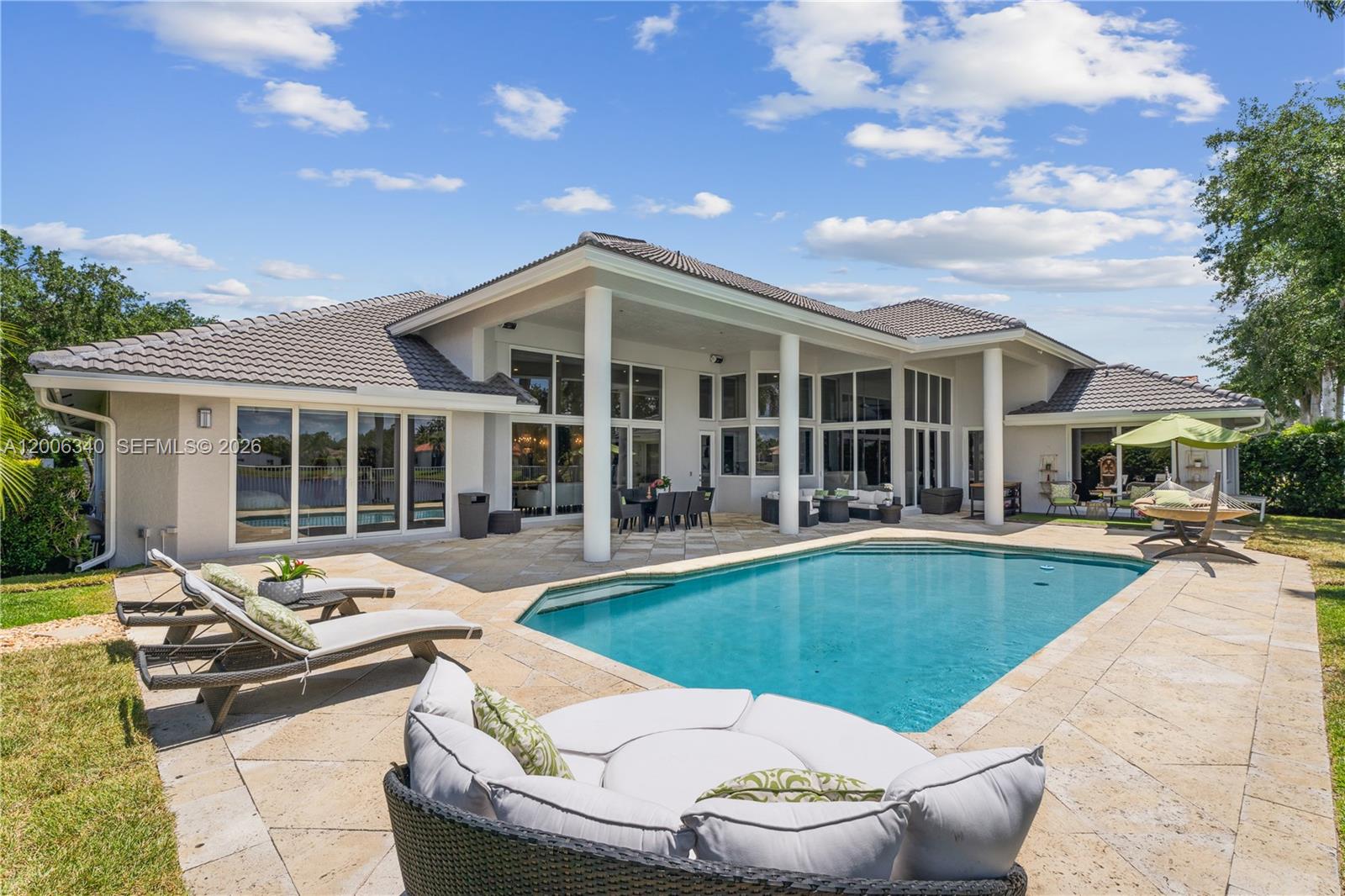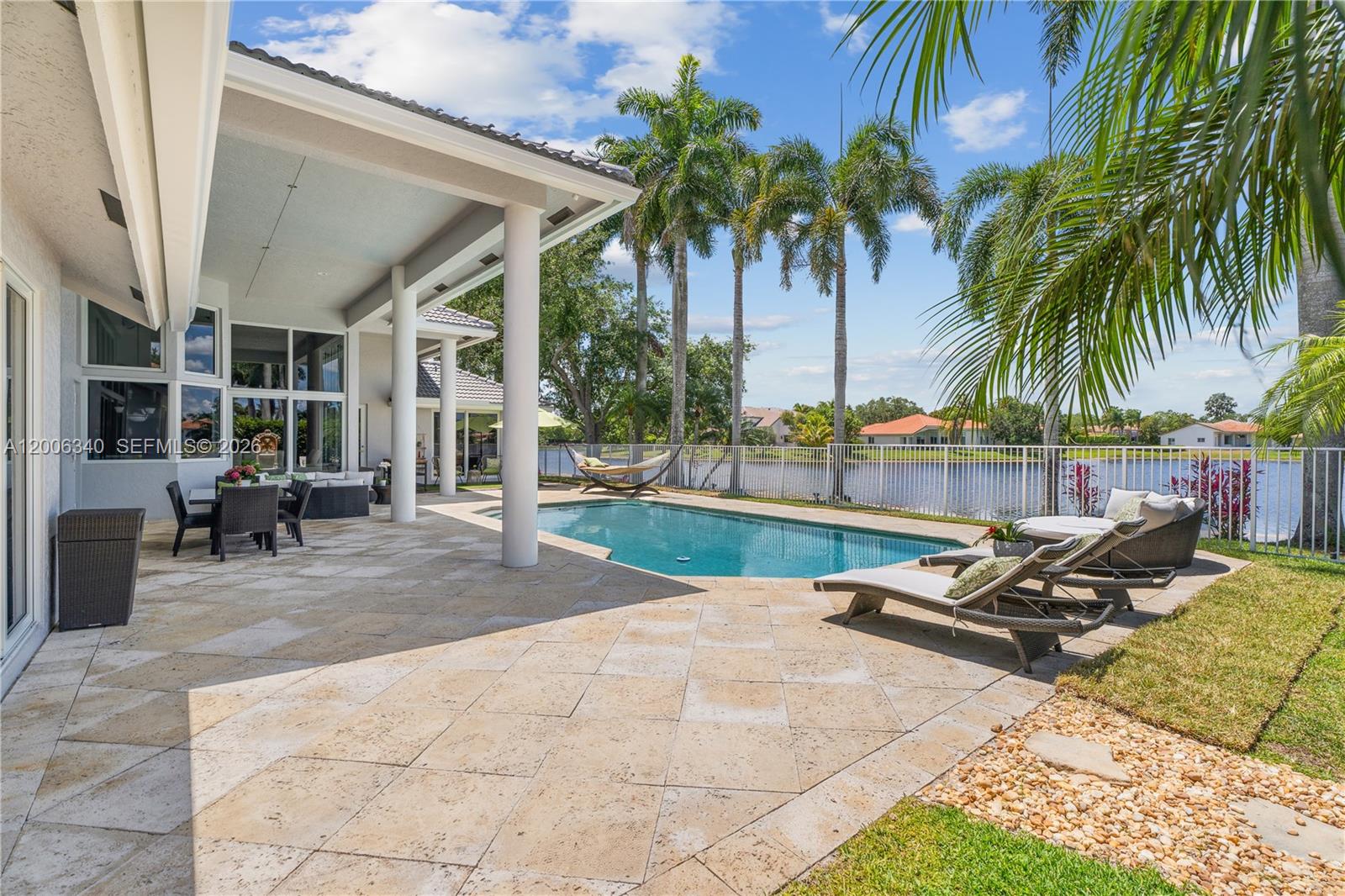 Stunning single-story estate in the exclusive Weston Hills Country Club, set on an oversized 0.41-acre waterfront lot with over 5,800 total square feet. This exceptional residence showcases soaring ceilings—higher than any other floor plan—and an elegant, open design throughout. Featuring 6 spacious bedrooms, 5.5 luxurious bathrooms, and a 3-car garage, the home has been beautifully updated with polished marble floors, fresh interior paint, a new roof, three new A/C units, and all-new impact windows and doors. Designed for both grand entertaining and everyday living, the spectacular chef's kitchen boasts the latest in contemporary design and premium finishes, all overlooking the resort-style pool and breathtaking infinity lake views. Located within a prestigious golf course community and zoned for top-rated A+ schools, this remarkable estate offers the ultimate Weston lifestyle.