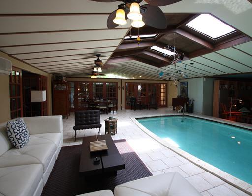 Amazing custom home with indoor heated pool: This Mid-Century Modern gem was designed by a significant Hollywood architect. All rooms open to pool area with French doors. The classic feel of the home is maintained, but functionally is has been fully updat ed. Kitchen has granite counters, wood cabinets & stainless steel appliances. Hurricane impact windows. New roof. Multi zone A/C system. The waterfront lot has 125 feet of ocean- access frontage and is on a cul-de-sac with a golf course across the street.