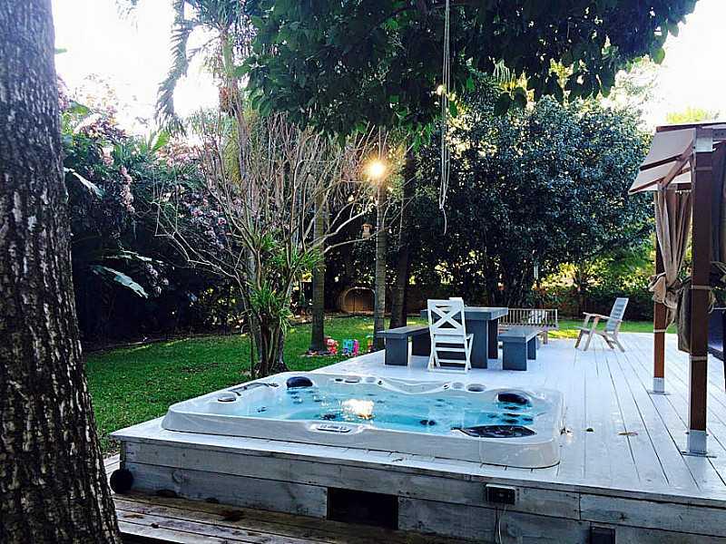This enchanting tropical lush paradise on a double lot (16,925 sq ft) secluded by a stunning range of vibrant color + foliage including bamboos + fruit trees is a GEM! There is nothing like it in Miami Shores! This 3/2 plus Den w/ 1854 sq ft features a br and new all white gourmet chef's kitchen w/ Bosh appliances + a gas range, high vaulted ceilings, brand new metal roof (under warranty), new bathrooms + white wood floors. Sprinkler system on a well. 2000 sq ft deck + 8 person jaquzzi!