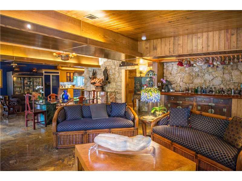 Architecturally distinctive home in prestigious guard gated Four Way Lodge Estates. Expansive living spaces overlooking tropical pool surrounded by coral rock wall for the utmost in privacy. Potential to easily reconvert to 3BR/3BA. Features include wood beamed ceilings, custom built-ins and cook's kitchen w/island & gas range. French doors open from all rooms to wrap-around porch which surrounds the homes upper level. Situated high on a coral ridge & not in a flood zone. Walk to the Grove village center.
