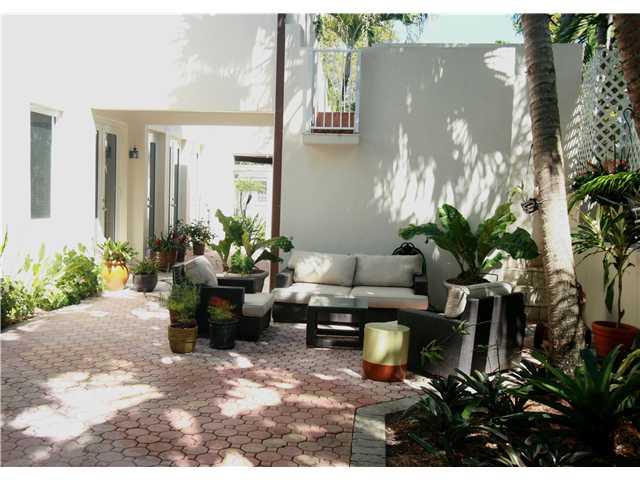 Two-story contemporary on 5000' lot with walled-in,tree-covered brick courtyard.Low maintenance/lots of entertaining areas.LR,DR, Kit/Fam rm.1/2 bath down.Upstairs is 3/2. Custom crown moldings,high ceilings, great indoor/outdoor flow with new impact wind ows and ten foot doors that allow lots of light. Covered porch leading from second floor to a rooftop terrace over the garage. Outside stairs lead to a garden. Alarm system, gate camera, and programmble timers for lighting. Fabulous. A private oasis.