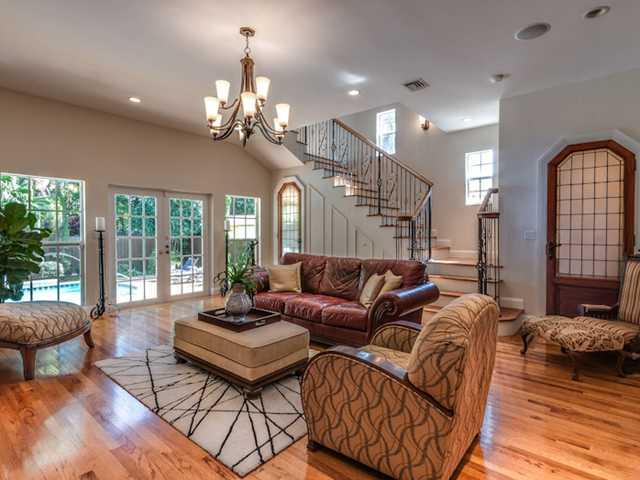 Turnkey, 4 bed/3.5 bath, classic Mediterranean. Shaded front porch, pergola & pool area have natural yellow marble pavers & keystone trim. Private fenced & landscaped back yard has chlorine-free eco-pool, 2 master suites (1up,1down)1 w/separate tub and sh ower. 9-10' ceilings throughout! Continuous oak floors w/maple inlays! Crown moldings,scalloped archways, abundant finished closets, surround sound indoor & out, wireless alarm system & Lutron dimmer lighting. Eat-in kitchen w/kenmore Elite gas range.