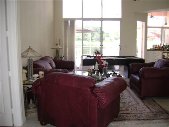 Luxury waterfront estate home on golf cource. Home boasts a peaceful backyard,caged heated pool/spa with water fountain and balcony with lake views. The upgraded kitchen features granite counters, center island, wood cabinetry and wet bar. Tile floors and carpet in bedrooms. Master walk-in closet, 2 car & golf cart garage with a circle driveway. The community is gated with 24hr security guard. Low maint fee $187/m including cable,alarm,gate guard . This is a must see!